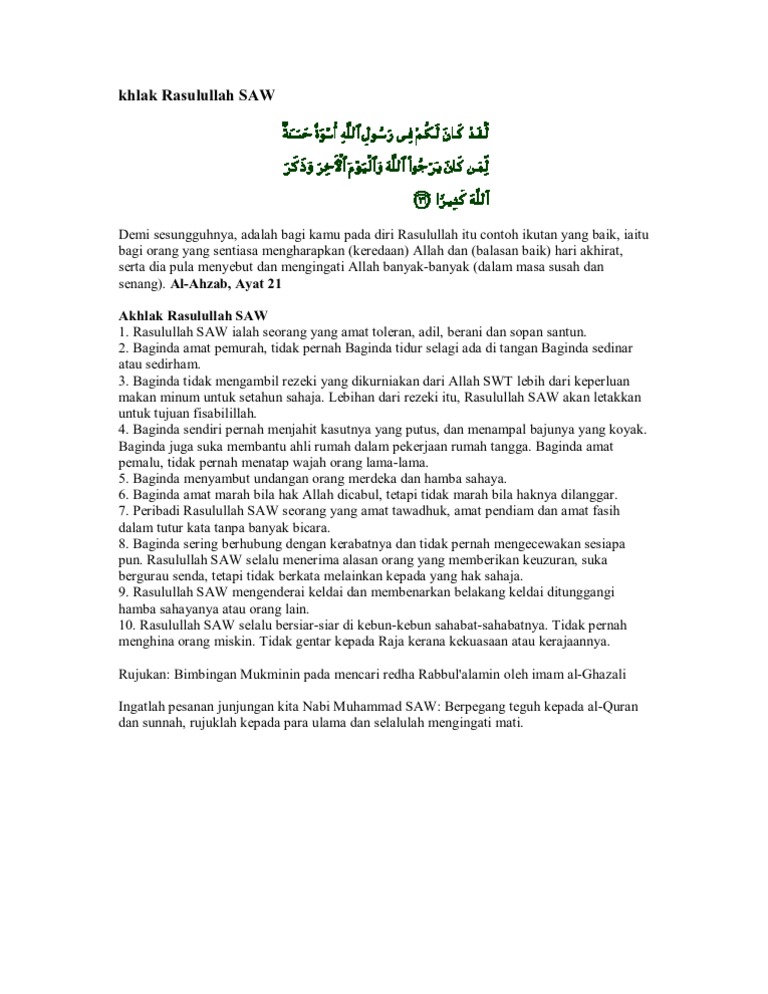 Contoh akhlak terpuji nabi muhammad saw banyak contoh akhlak terpuji rasulullah saw. Jawabnya mudah iaitu dengan mencontohi akhlak rasulullah saw. Yusoff dan noor naemah abd. Akhlak rasulullah saw terhadap isteri. Muhammad abduh yamani 2001. Harapannya tentu saja agar mereka sedari dini sudah mengenal tentang berbagai sifat kemuliaan dari junjungan kita muhammad saw.