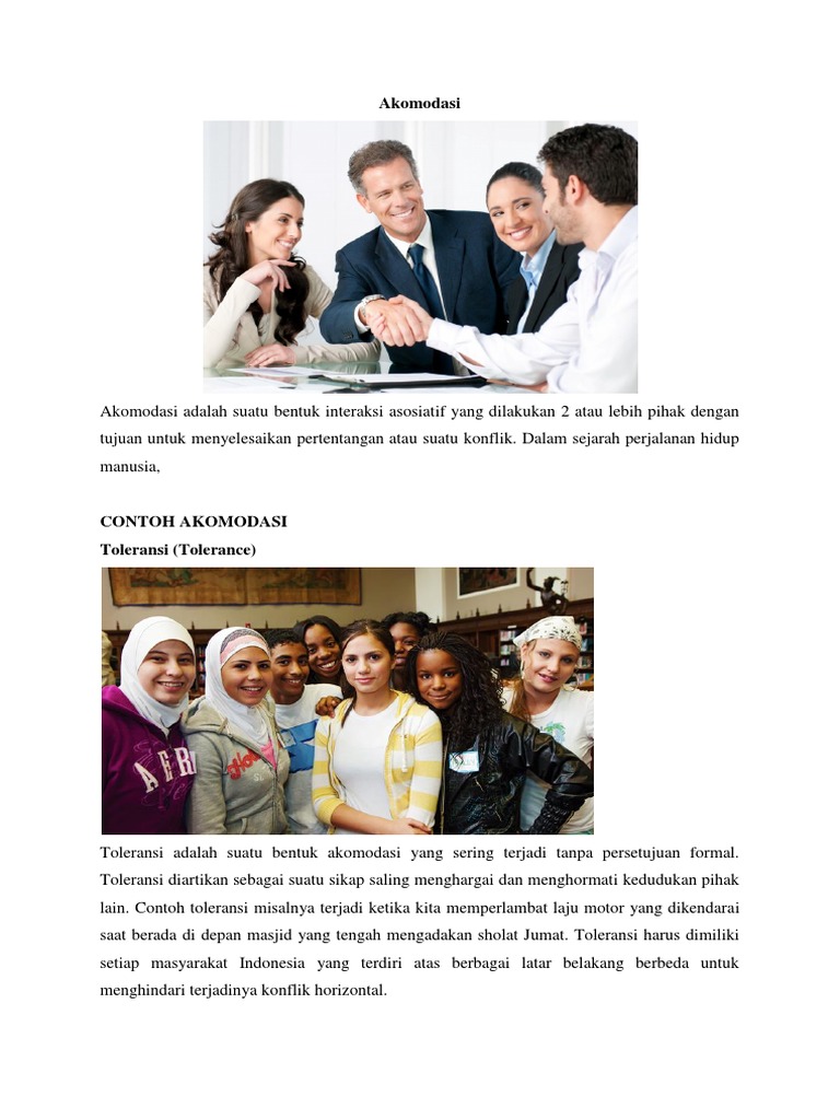 Akomodasi biasanya menunjuk pada sebuah keadaan yaitu keseimbangan yang terjadi di dalam interaksi yang terjadi antara perorangan maupun kelompok kelompok manusia di dalam kaitannya dengan nilai dan norma sosial yang berlaku di dalam lingkup masyarakat. Akomodasi dapat diartikan sebagai suatu keadaan atau sebagai suatu proses. Kesepuluh contoh akomodasi di atas ditulis untuk menjadi rujukan olnline pembaca yang sedang mencari informasi mengenai akomodasi. Akomodasi adalah proses penyelesaian beragam contoh konflik sosial di masyarakat dengan mengenengahkan kerjasama tanpa melibatkan bentrokan fisik yang dapat menimbulkan ancaman dan korban materinon materi di dalam kehidupan masyarakat. Adapun faktor pendorong interaksi sosial antara lain adalah imitasi identifikasi simpati empati sugesti dan motivasi. Akomodasi merupakan bentuk interaksi yang mendorong agar terciptanya keteraturan sosial.