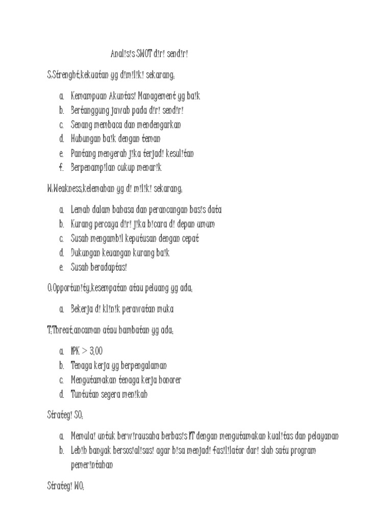 Contoh analisis swot diri sendiri sebagai mahasiswa. Saya akan mencoba untuk menganalisis swot yang ada pada diri saya mulai dari sekarang hingga 5 taun yang akan datang. 1 contoh analisis swot diri sendiri. Melalui anaysis swot yang telah dipaparkan diatas maka kita sebagai pribadi dapat melakukan analysis terhadap diri kita mengenai kelebihan kekurangan kesemapatan dan ancamam yang ada dan tercermin pada diri kita untuk selanjutnya dapat dijadikan sebagai bahan evaluasi terhadap diri sendiri agar nantinya kita lebih mengenali berbagai potensi yang dapat dikembangkan dan kekurangan yang dapat. Berikut ini beberapa contoh analisis swot. Analisis swot dapat diterapkan dengan cara menganalisis dan memilah berbagai hal yang mempengaruhi keempat faktornya kemudian menerapkannya dalam gambar matrik swot dimana aplikasinya adalah bagaimana kekuatan strengths mampu mengambil keuntungan advantage dari peluang opportunities yang ada bagaimana cara mengatasi kelemahan weaknesses yang mencegah keuntungan advantage dari. Berikut adalah beberapa contoh analisis swot yang akan saya sampaikan kami harap ini dapat membantu yaitu sebagai berikut.