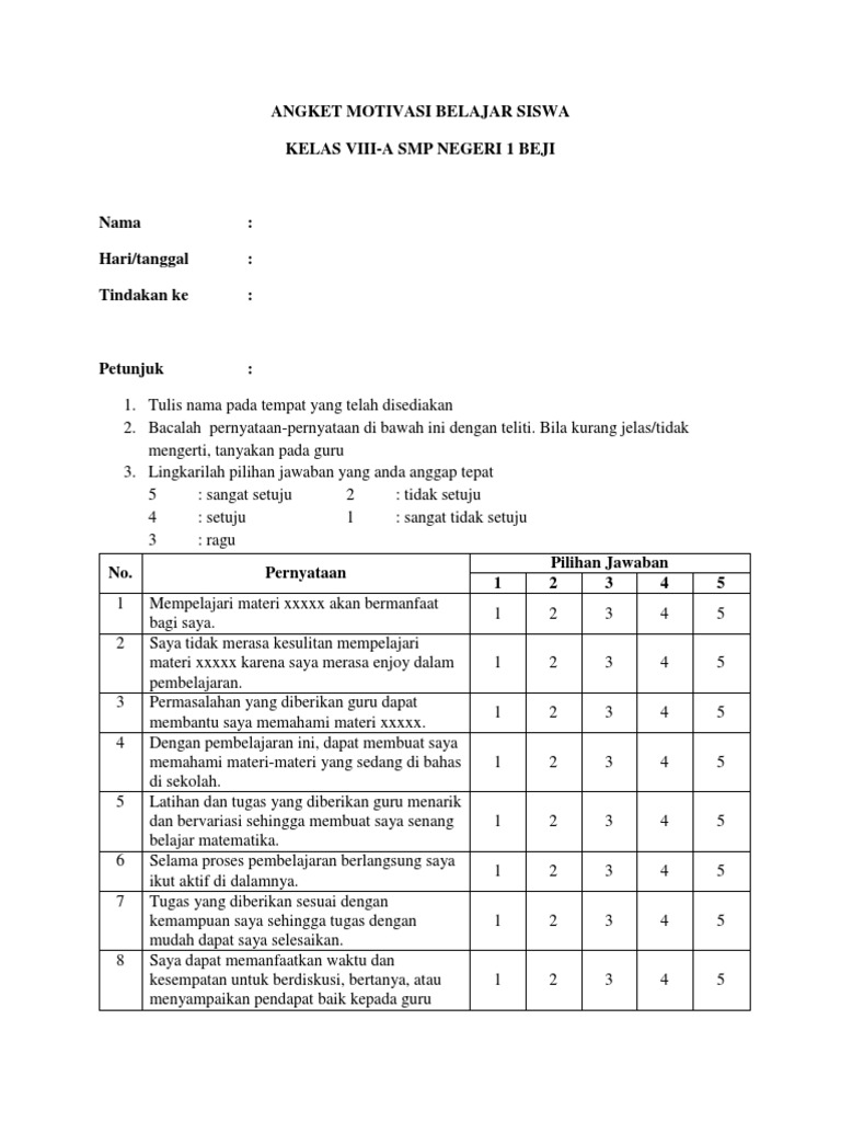 Contoh angket motivasi belajar. Contoh angket motivasi dan minat siswa. Berilah tanda silang. Maka dari itu saya sharekan contoh angket. Tuliskan nama kelas dan nomor absen. Academiaedu is a platform for academics to share research papers. Bacalah pertanyaan pertanyaan di bawah ini dengan teliti.