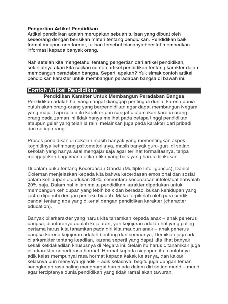 Contoh artikel pendidikan karakter. Tetapi di sini akan memberikan contoh artikel dengan 3 pembahasan tersebut. Pendidikan adalah hal yang sangat dianggap penting di dunia karena dunia butuh akan orang orang yang berpendidikan agar dapat membangun negara yang maju. Hal tersebut memerlukan upaya terus menerus dan refleksi mendalam untuk membuat rentetan keputusan moral yang harus ditindak lanjuti dengan aksi nyata sehingga menjadi hal yang praktis dan reflektif. Sebenarnya ada banyak pembahasan yang bisa ditulis dalam suatu artikel. Selanjutnya adalah contoh contoh artikel. Artikel pendidikan karakter anak usia dini pendidikan usaha pada oleh sebab itu kita sebagai orang tua hendaknya memanfaatkan masa emas anak buat memberikan pendidikan karakter yang baik bagi anak.