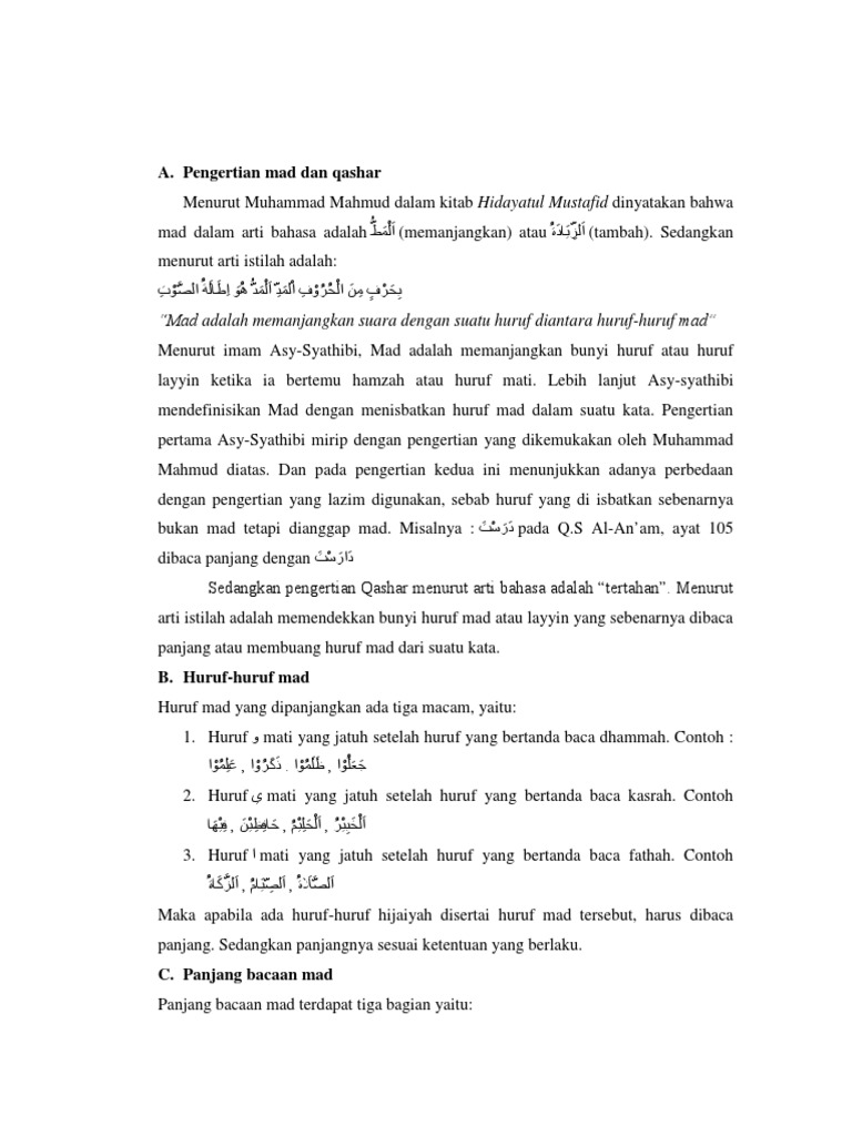 Mad wajib muttashil مدواجب متصل apabila ada mad thabii bertemu dengan hamzah ء didalam satu kalimat atau kata. Secara istilah mad iwad ialah berhenti bacaan pada tanwin fathah di akhir kalimat hidayatul mustafiq. Bab huruf mad dan bagian bagiannya bab ini menjelaskan tentang huruf huruf mad dan bagian bagiannya yaitu. Mad fari adalah semua mad selain mad thabii karena bersumber dari mad thabii maka disebut mad fari. Dimana mad berarti panjang dan thabii mempunyai arti biasa.