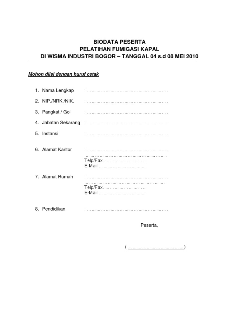Isi biodata peserta diklat kepemimpinan dan teknis pesan. Contoh biodata peserta pelatihan terbaru 2019 hai sob. Untuk mengisi biodata diwajibkan untuk login akun google terlebih dahulu. Contoh biodata diri terbaru dan lengkap biodata diri sering kali digunakan untuk informasi penting tentang data diri anda yang biasanya dibutuhkan dalam sebuah identitas atau dalam sebuah formulircontoh biodata biasanya diperlukan untuk mendaftar sekolah atau untuk melamar sebuah pekerjaan. Berikut ini adalah contoh biodata peserta biasanya digunakan untuk pelatihan kepemimpinan semoga bermanfaat. Isi biodata peserta diklat fungsional untuk peserta diklat fungsional harap mengisi surat pernyataan peserta dan surat pernyataan pimpinan download.