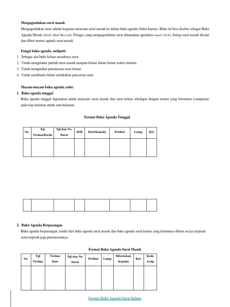 Contoh buku agenda tunggal. Adalah suatu buku yang digunakan untuk mencatat surat surat masuk dalam satu tahun. Agenda dengan format buku tunggal adalah buku yang digunakan untuk merekap aktivitas dan data tentang surat masuk dan surat keluar secara berurutan pada satu buku yang sama. Buku agenda tunggalcampuran yaitu buku agenda yang dipergunakan untuk mencatat surat masuk dan keluar sekaligus secara berurutan campuran pada tiap tiap halamannya. Contoh buku agenda kembar. Maaf saya copas ya dan terima kasih telah berbagi. Contoh buku agenda surat masuk.