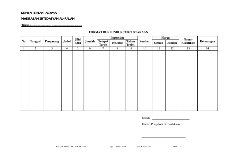 Contoh buku induk perpustakaan. Format buku induk perpustakaan. Pada hari kamis 14 juli 2016 contoh buku induk perpustakaan dalam administrasi perpustakaan sekolah telah dipublikasikan dengan tujuan menambah informasi referensi dan menjadi sebuah jawaban dari pertanyaan pencarian anda di google search selama ini. Diisi dengan nomor induk buku setiap buku didaftar satu persatu meskipun judulnya sama sehingga tiap buku mempunyai nomor induk sendiri sendiri. Tasikmalaya tgl penerimaan no induk pengarang judul edisi kota terbit penerbit tahun terbit bahasa asal koleksi harga no klasifikasi ket 4 jan 2012 1428 dzulmani mengenal kitab kitab hadis 1 yogyakarta insan madani 2008 indonesia block grand 2xz4 4 jan 2012 1429 rianty amanda terapi jus untuk kesehatan 1 bandung sanggabuana 2008. Administrasi perpustakaan contoh buku induk perpustakaan untuk pustakawan sekolah ini bisa bapakibu pengelola perpustakaan gunakan sebagai data base induk data dari setiap buku yang ada diperpustakaan untuk kelengkapan administrasi dan lengkapnya program kerja perpustakaan. Untuk impresum mencakup tempat terbit penerbit dan tahun terbit saya kira itu juga mudah tinggal anda lihat saja dibukunya.