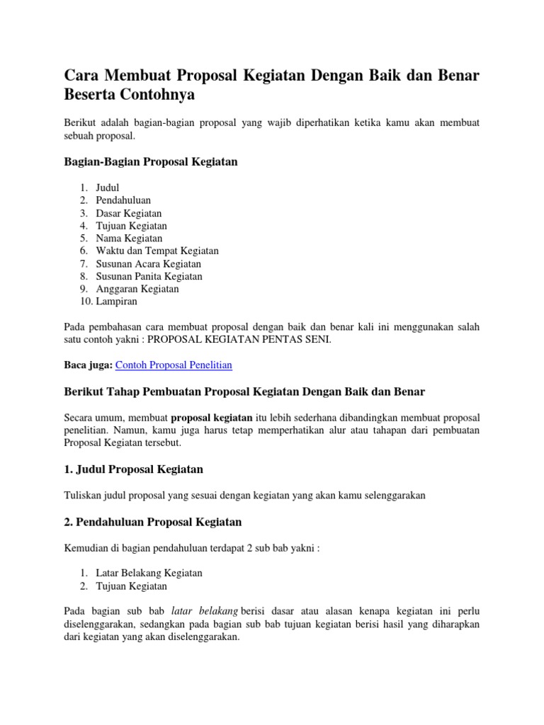 Dalam membuat proposal ada sistematika penulisan yang mesti kita ikuti dan sistematika dalam penulisan proposal bergantung dari jenis proposal apa yang akan anda buat sebagai contoh adalah antara. Contoh proposal dapat membantu seseorang ketika hendak membuatnya. Demikianlah artikel kali ini tentang cara membuat proposal penelitan dan contoh pembuatan proposal. Selanjutnya dibawah ini saya sajikan contoh proposal usaha versi word doc yang bisa kamu download. Bila lelah berwirausaha mungkin kamu perlu bekerja dulu. Inilah cara membuat surat lamaran kerja yang menarik.