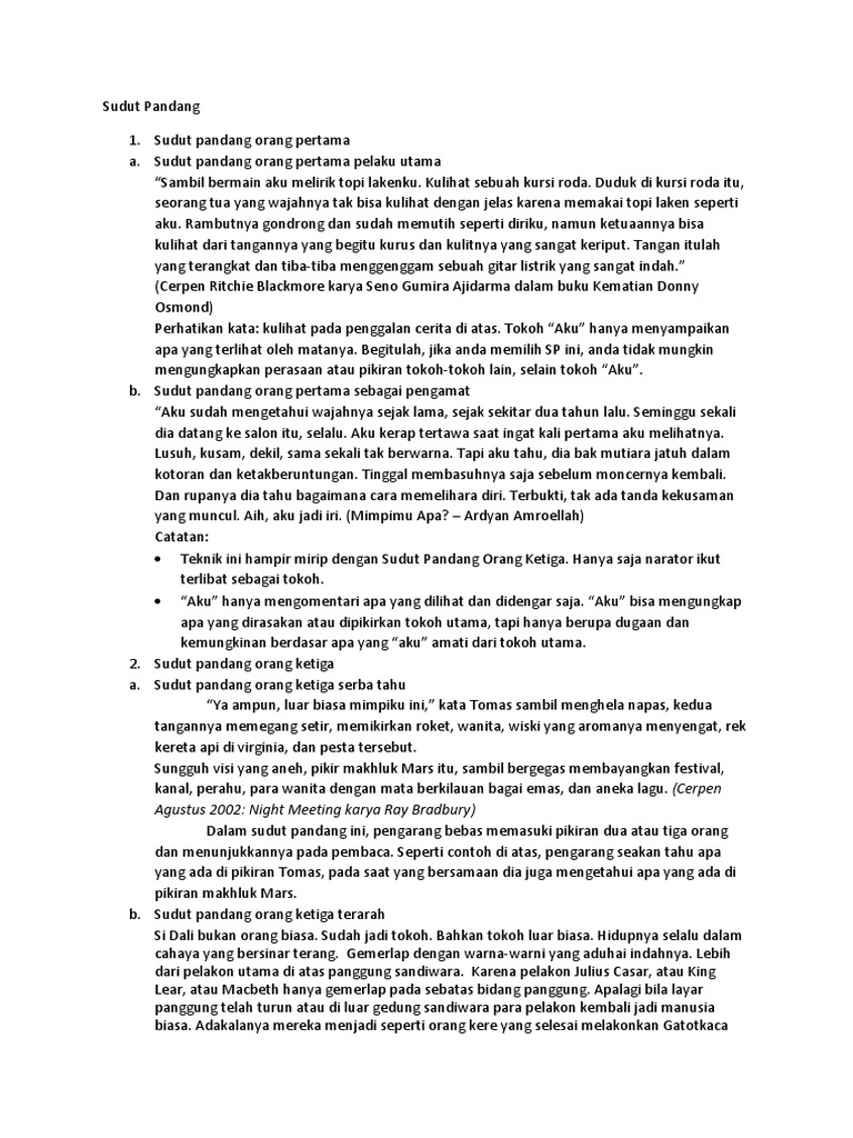 Contoh cerpen sudut pandang orang ketiga serba tahu. Semoga bisa memberi manfaat untuk para pembaca sekalian. Cerpen sudut pendang orang pertama pelaku utama cerpen sudut pandang orang pertama pelaku sampingan cerpen sudut pandang orang ketiga pelaku utama dan cerpen sudut pandang orang ketiga pelaku sampingan serta cerpen sudut pandang orang ketiga serba tahu. Sementara sudut pandang orang ketiga juga dibagi menjadi dua bagian yaitu sudut pandang orang ketiga serba tahumahatahu dan sudut pandang orang ketiga pengamat. Untuk itu pembahasan kali ini tentang penjelasan dari sudut pandang. Demikianlah contoh cerita sudut pandang orang ketiga serba tahu dalam bahasa indonesia. Sudut pandang pengamat serba tahu dalam hal ini pengarang bertindak seolah olah mengetahui segala peristiwa yang dialami tokoh dan tingkah laku tokoh.