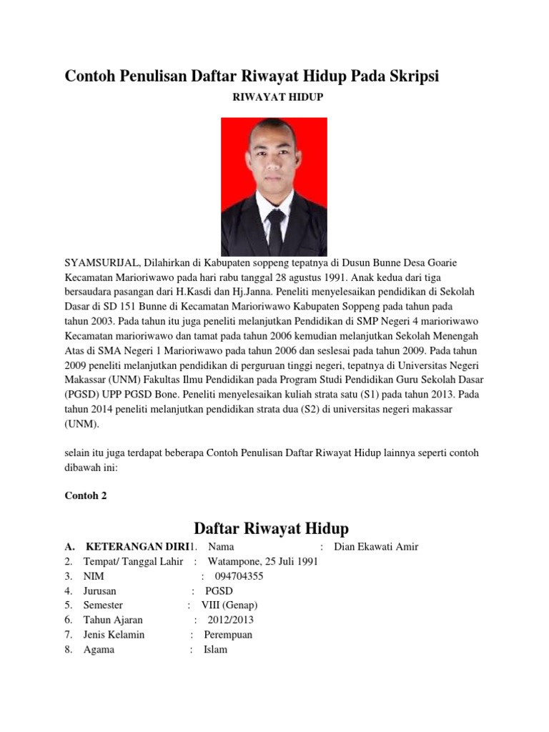 Contoh riwayat hidup yang baik dan benar untuk skripsi riwayat hidup. Anak ketiga dari tiga bersaudara pasangan bapak hamzah dan ibu samsiar. Contoh daftar riwayat hidup skripsi. Nah agar tidak bingung dan pusing tujuh keliling untuk urusan yang remeh satu ini kali ini kita akan memberikan contoh daftar riwayat hidup atau contoh cv yang baik dan benar disertai dengan cara membuat dan format daftar riwayat hidup yang biasanya digunakan untuk suatu kegiatan formal maupun melamar sebuah pekerjaan.