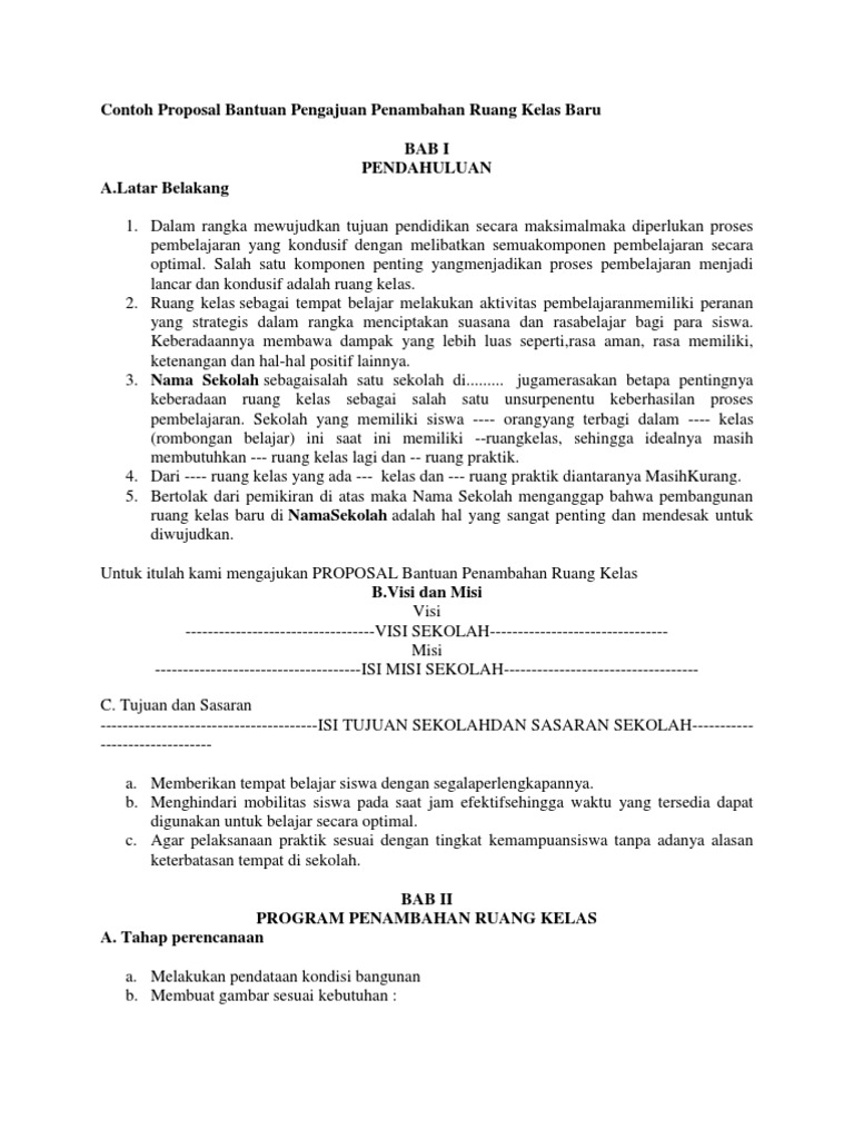 Contoh proposal bantuan pengajuan penambahan ruang kelas baru. Dengan bantuan sarana dan prasarana yang memadai maka kegiatan akan berjalan sesuai dengan yang diharapkan bersama. Hasil penelitian menunjukkan bahwa pertumbuhan penduduk usia sekolah menjadi salah satu faktor penentu kebutuhan ruang kelas terus mengalami peningkatan namun tidak diikuti oleh pembangunan ruang kelas baru rkb atau rehabilitasi ruang kelas. Sampai jumpa lagi pada. Selain data karakteristik siswa diperoleh data jumlah siswa rombongan belajar ruang kelas dan keadaan ruang kelas 5 tahun terakhir yang diperoleh di bagian sub bina program. Teknik analisis data menggunakan pengumpulan data input data dan pengolahan data menggunakan metode proyeksi dengan mathematical equations approach.