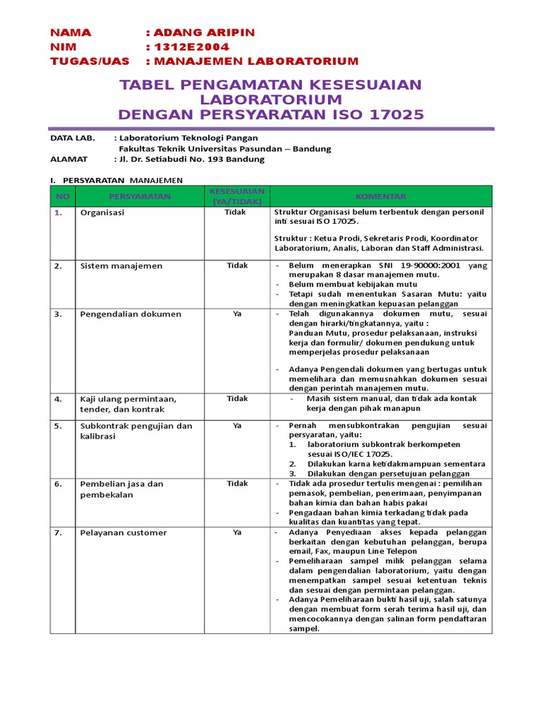 Termasuk perangkat seperti contoh manual mutu. Hierarki dokumentasi sistem manajemen laboratorium berdasarkan sni isoiec 170252008 terdiri dari 4 jenis dokumen yaitu dokumen level 1 panduan mutu dokumen level 2 prosedur dokumen level 3 instruksi kerja dan dokumen level 4 formulir. Kemudian pada tahun 1999 standar ini berganti nama menjadi isoiec 170251999 selanjutnya direvisi pada tahun 2005 dan terakhir pada tahun 2017 yaitu isoiec 170252017. Kesesuaian diri dan laporan asesmen terhadap isoiec 17025. Harga paket lengkap dokumen iso 170252017 persyaratan umum kompetensi laboratorium pengujian dan laboratorium kalibrasi rp 7500000 tujuh juta lima ratus ribu rupiah pengiriman file via email. Untuk menghindari hal tersebut continued.