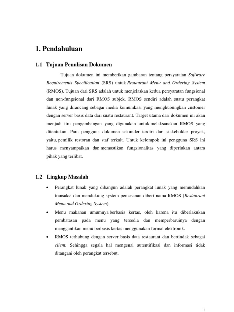 Contoh dokumen srs lengkap. 141 bab 1 pendahuluan merupakan pengantar dokumen srs yang berisi tujuan penulisan dokumen lingkup masalah pengembangan perangkat lunak juga memuat definisi akronim dan istilah yang digunakan serta deskripsi umum dokumen yang merupakan ikhtisar dokumen srs. Untuk penamaan dokumen ini selanjutnya akan digunakan istilah skpl. Tuliskan abstrak dari isi dokumen srs di sini. 11 tujuan penulisan dokumen dokumen spesifikasi kebutuhan perangkat lunak s kpl merupakan spesifikasi kebutuhan perangkat lunak yang akan dikembangkan. Bagian pertama berisi penjelasan tentang dokumen srs yang mencakup. Pendahuluan 11 tujuan tujuan pembuatan software ini adalah untuk mengotomatisasi proses jual beli barang secara online.