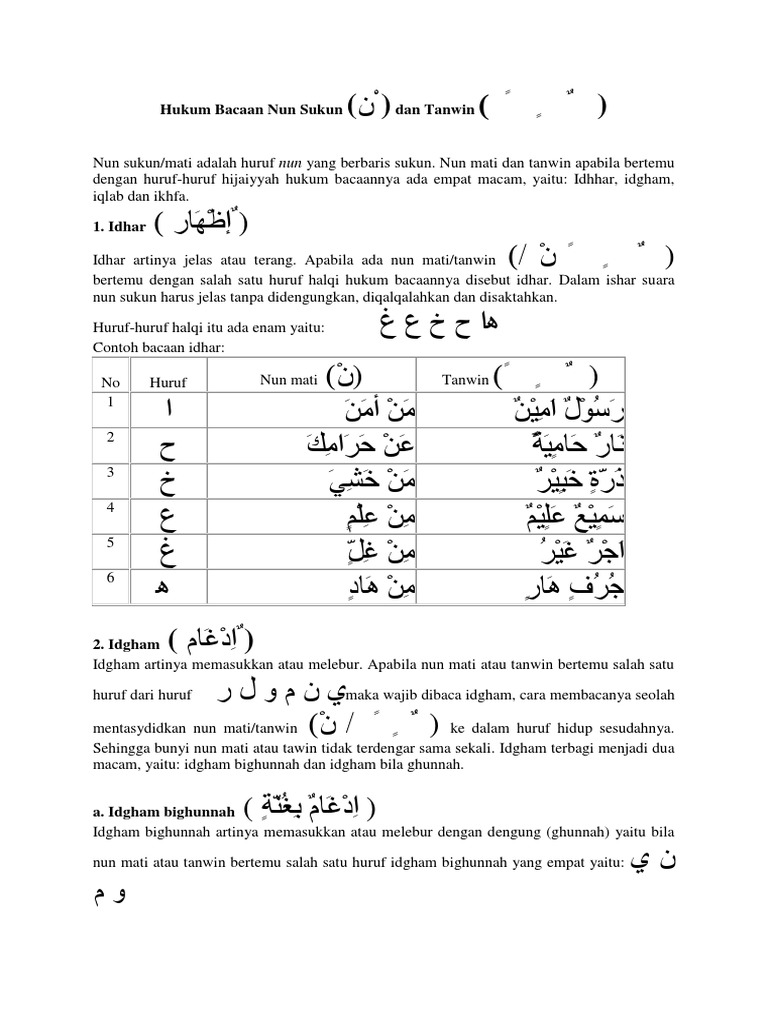 Contoh huruf idgham bighunnah. Contoh idgham bighunnah kedua ialah ada didalam surat az zalzalah ayat 6 seperti yang ada di gambar diatas dan bisa kalian lihat sendiri bahwa di ayat surat az zalzalah tersebut terdapat tanwin inn bertemu dengan huruf hijaiyah yaa dan selain contoh contoh ini tentunya masih banyak sekali contoh yang lain didalam ayat ayat al quran. Cara membaca hukum idgham bighunnah adalah dengan memasukkan atau mentasydidkan huruf idgham setelah huruf nun mati dengan mendengung. Apa itu huruf idgham bighunnah dan bilaghunnah akan dibahas di bawah ini nanti. Di atas adalah contoh contoh bacaan idgham bighunnah akan tetapi apabila nun sukun dan tanwin bertemu dengan salah satu huruf yang empat tersebut di atas di dalam satu perkataan kalimat maka bukanlah bacaan idghom artinya tidak dibaca idgham dan tidak di tasydidkan dan bahkan harus di baca terang jelas dan disebut idzhar wajib seperti contoh. Idgham secara bahasa berarti meleburkan atau memasukan dalam hukum nun mati idham berarti meleburkan nun matitanwinjadi cara membaca idgham bighunnah adalah menggabungkan bunyi nun sukun atau tanwin ke huruf idgham dengan didengungkan selama satu alif. Jika ada huruf hijaiyah nun sukun atau tanwin bertemu dengan salah satu dari empat huruf hijaiyah yaitu mim nun wawu dan yaa.