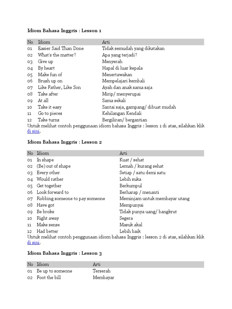 Contoh ungkapan bahasa indonesia ungkapan atau biasa juga disebut idiom adalah gabungan kata yang membentuk arti baru dan tidak dapat ditafsirkan dengan kata pembentuk dasarnya. Baiklah cukup sekian 100 idiom dalam bahasa inggris dan contoh kalimatnya. Idiom adalah kumpulan kata yang disusun dimana artinya tidak dapat ditebak atau diartikan secara terpisah dari kata kata penyusunnya. Dalam percakapan sehari hari native speaker sering menggunakan idiom yang bermakna kiasan. Jadi dalam artikel 100 idiom bahasa inggris ini kami sudah membagi idiom ke dalam tema tema umum. Idiom peribahasa dan ungkapan adalah bagian penting dari bahasa inggris sehari hari.