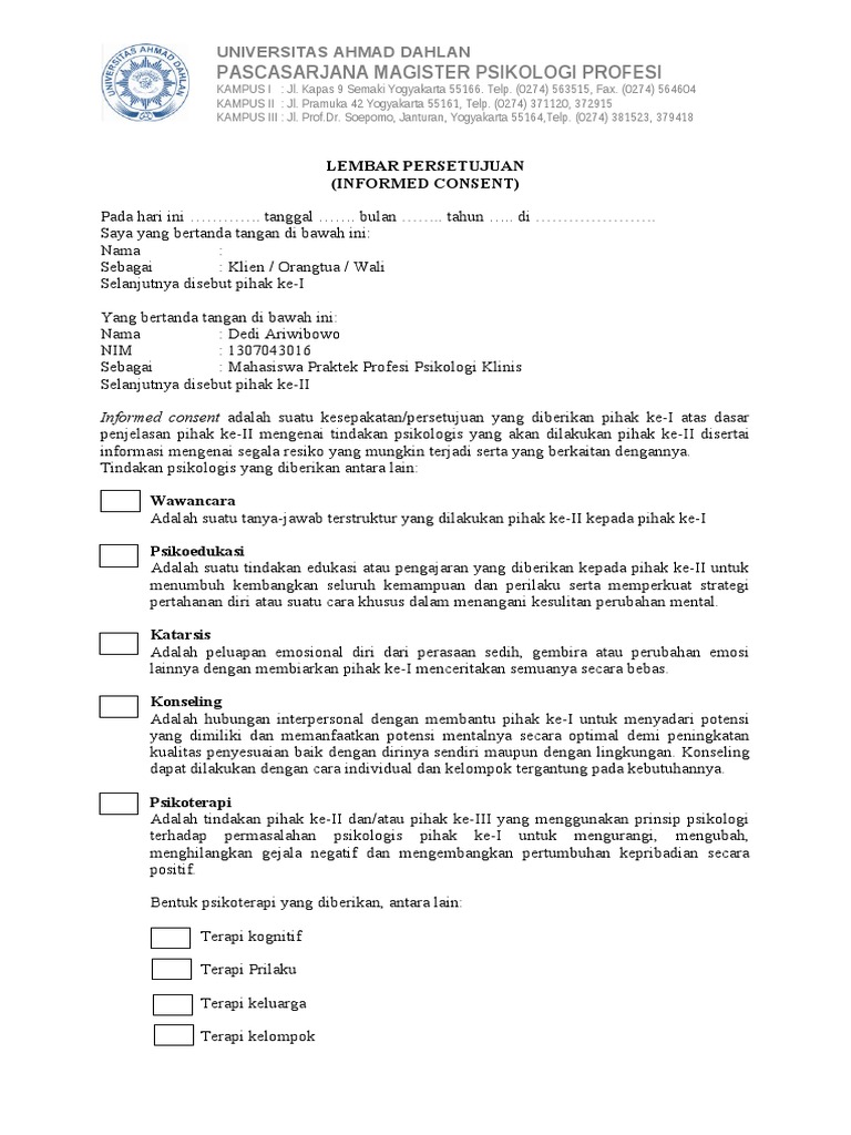 Contoh informed consent psikologi. Subyek yang bertanda tangan di bawah ini bersedia diwawancara untuk dimintai data dan direkam oleh pewawancara. Informed consent saya adalah mahasisiwi fakultas kedokteran universitas lampung yang bernama hanifah rahmania. Lampiran informed consent saya yang bernama joko dengan nim 705090114 sebagai mahasiswa fakultas psikologi universitas. Saya yang bertanda tangan di bawah ini. Perkembangan kecerdasan emosi. Ocd menyerang mental dengan ciri c.