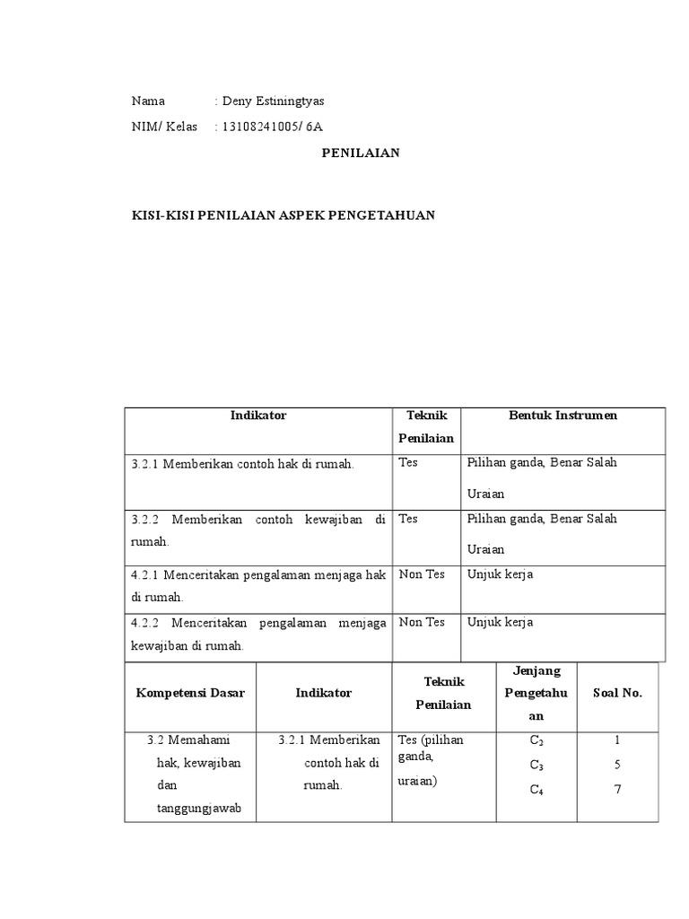Penyusunan instrumen tes dan non tes sebagai instrumen penilaian pembelajaran. Alat atau instrumen merupakan sesuatu yang dapat digunakan untuk mempermudah seseorang melaksanakan tugas atau mencapai tujuan dengan lebih efektif dan efisien. Tehnik penilaian ini umumnya untuk menilai kepribadian anak secara menyeluruh meliputi sikap tingkah laku sifat sikap sosial ucapan riwayat hidup dan lain lain. Yang berhubungan dengan kegiatan belajar dalam pendidikan baik secara individu maupun secara kelompok. Sedangkan teknik penilaian non tes tulis maksudnya adalah bentuk evaluasi non tes yang berbentuk tulisan atau non lisan. Berdasarkan bentuk atau jenisnya tes dibedakan menjadi tes uraian dan obyektif sedangkan nontes terdiri dari observasi wawancara interview angket questionaire pemeriksaan document documentary analysis dan sosiometriinstrumen yang berbentuk test bersifat performansi maksimum sedang instrumen nontes bersifat performansi.