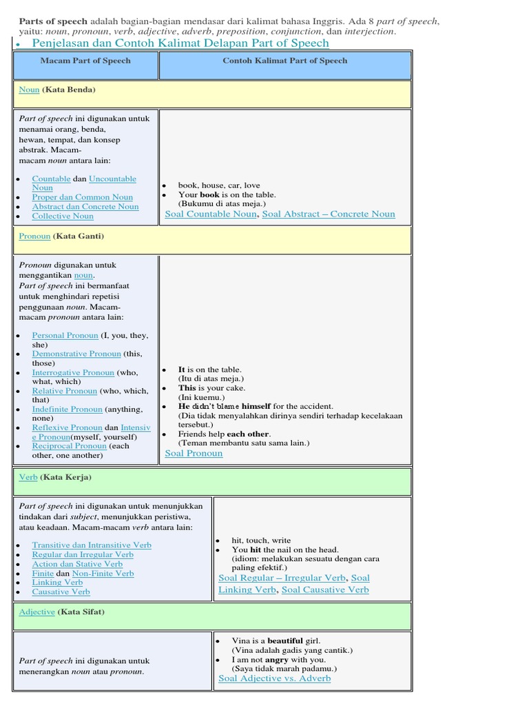Hal ini juga penting dipelajari bagi yang baru belajar bahasa inggris karena kita perlu memahami bagian bagian kalimat yang membentuk kalimat tersebut secara utuh dan benar. Pengertian dari part of speech secara bahasa parts of speech berarti bagian bagian kalimat. Berdasarkan fungsinya dalam kalimat verb dibagi menjadi dua yaitu sebagai kata kerja bantu dan kata kerja utama. They study english everyday. Conjunction kata penghubungpart of speech ini berfungsi untuk menhubungkan dua kata frasa atau paragrafcontoh. Part of speech adalah pengelompokan kata berdasarkan fungsi masing masing dalam sebuah kalimat.