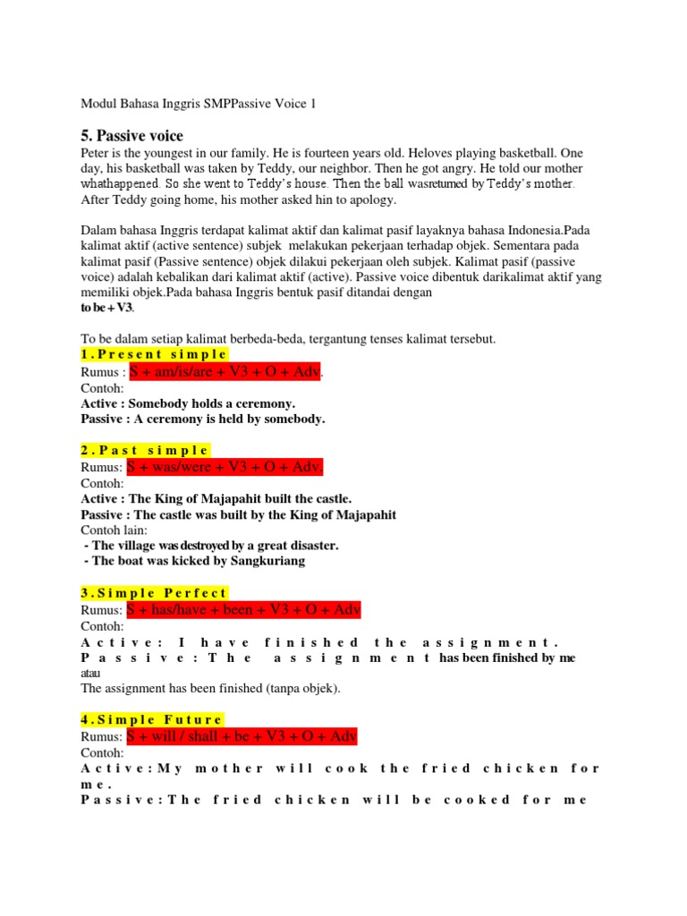 Passive voice is a type of sentence or clause in which the subject receives the action of the verb passive voice adalah jenis kalimat atau klausa di mana subjek menerima tindakan dari kata kerja. Kalimat non verbal kalimat non verbal tanpa kata kerja tidak dapat dibentuk menjadi kalimat pasif. Dengan kata lain anda bisa menggunakannya atau tidak. Caranya gampang banget dan dapat dipahami oleh siapa saja terutama pelajar pemula. Contoh kalimat passive voice dalam 16 tenses bahasa inggris terlengkap welcome back to kbi. Untuk sahabat yang masih mencari cari kumpulan kalimat passive voice dalam berbagai jenis tenses dalam bahasa inggris maka sahabat dapat langsung melihat contoh contoh kalimat dibawah ini.