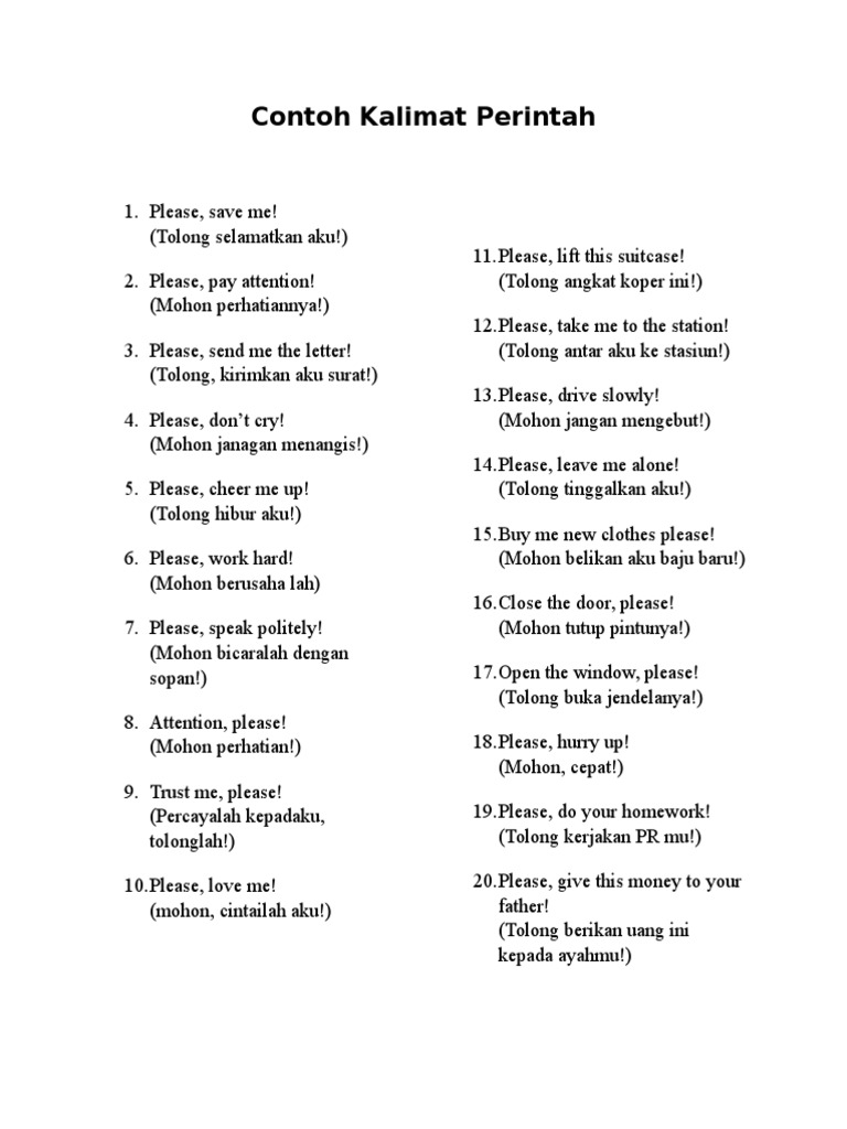 Kata yang sering digunakan dalam kalimat ini yaitu jangan dilarang jauhkan dan lain lain. Oleh karena itu terkadang kalimat larangan disertai pula dengan tanda seru. Untuk memudahkan memahami kalimat larangan berikut contoh kalimat larangan dalam bahasa inggris dan artinya. Sekilas kalimat larangan seperti contoh kalimat perintah dalam bahasa inggris namun keduanya berbeda. Jangan membuang sampah di mana saja. Kalimat perintah jenis ini memerintahkan ataupun meminta seseorang untuk tidak melakukan dan melarang orang lain dalam berbuat sesuatu.