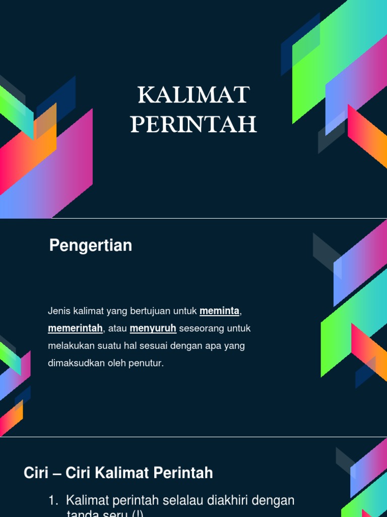 Kalimat perintah adalah salah satu kalimat yang mengandung makna perintah atau larangan. Ada banyak sekali contoh kalimat perintah seperti kalimat perintah ajakan larangan permohonan sindiran dan lain lain.