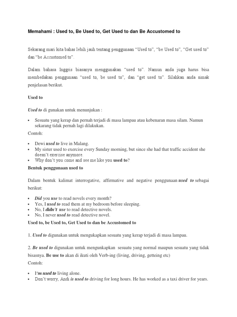 Penjelasan penggunaan dan contoh kalimat used to used to artinya adalah pernah. Used to bentuk aktif dan pasif. I used to care about you dulu biasanya saya perduli dengan mu. Present amisare used to havehas been used to past waswere used to dan future will be used to serta dapat digunakan pada kalimat positive negative not ataupun interrogative. Used to juga dapat digunakan dalam kalimat positif dan negatif contoh. Semoga bermanfaat para pembaca sbi.