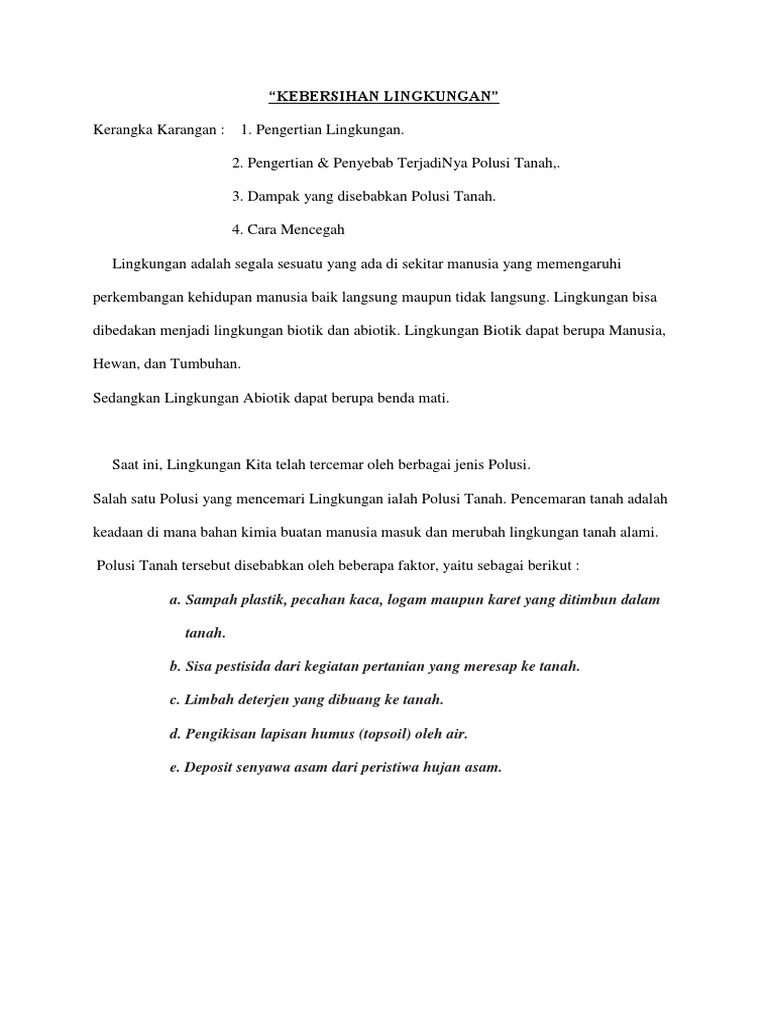 Kebutuhan akan air bersih pengelolaan sampah yang setiap hari diproduksi oleh masyarakat serta pembuangan air limbah yang langsung dialirkan pada saluransungai. Aku masih merasa malas untuk beranjak dari tempat tidurku. Sekolahku ini letaknya tidak jauh dari taman kota dan mempunyai sekitar 100 buah ruanganya yang sebgaian besarnya adlah ruang kelas. Jenis esai ini biasanya digunakan untuk mengekspresikan ide ide yang merupakan hasil dari aktivitas seseorang untuk tujuan menghibur. Klik di sini untuk informasi file lengkap contoh karangan bebas tentang lingkungan hidup selengkapnya. Cerita tentang lingkungan pada kali ini rumus coid akan membahas mengenai cerita tentang lingkungan di dalam pembahasan ini kita tulisan terbaru.