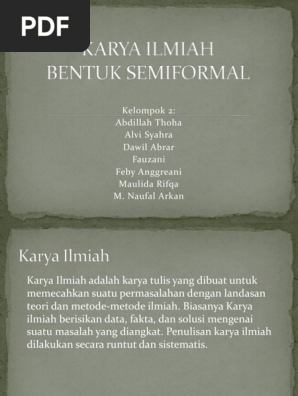 Maaf jika ada kekurangan dalam penulisan karya ilmiah ini jika ada pertanyaan silahkan anda tulis di kolom komentar mari kita bahas bersama sama. Download kumpulan contoh karya tulis ilmiah sederhana singkat populer formal dan semi formal remaja bahasa indonesia terbaru 2020. Karya ilmiah sendiri terdiri dari beberapa cabang seperti skripsi makalah resensi dan lain lain. Baru mendengar namanya saja pasti telah terbayang akan sulitnya untuk membuatnya. Pengertian karangan semi ilmiah ciri macam dan contoh karangan semi ilmiah lengkap karangan semi ilmiah adalah jenis karangan ilmu pengetahuan yang menyajikan fakta umum dan menurut metodologi penulisan yang baik dan benar ditulis dengan bahasa konkret gaya bahasa formal kata katanya teknis dan didukung dengan fakta umum yang bisa dibuktikan benar atau tidaknya. Yayasan pendidikan semeru soemadiharga puri permai blok c 2 no 22 tigaraksa tangerang.