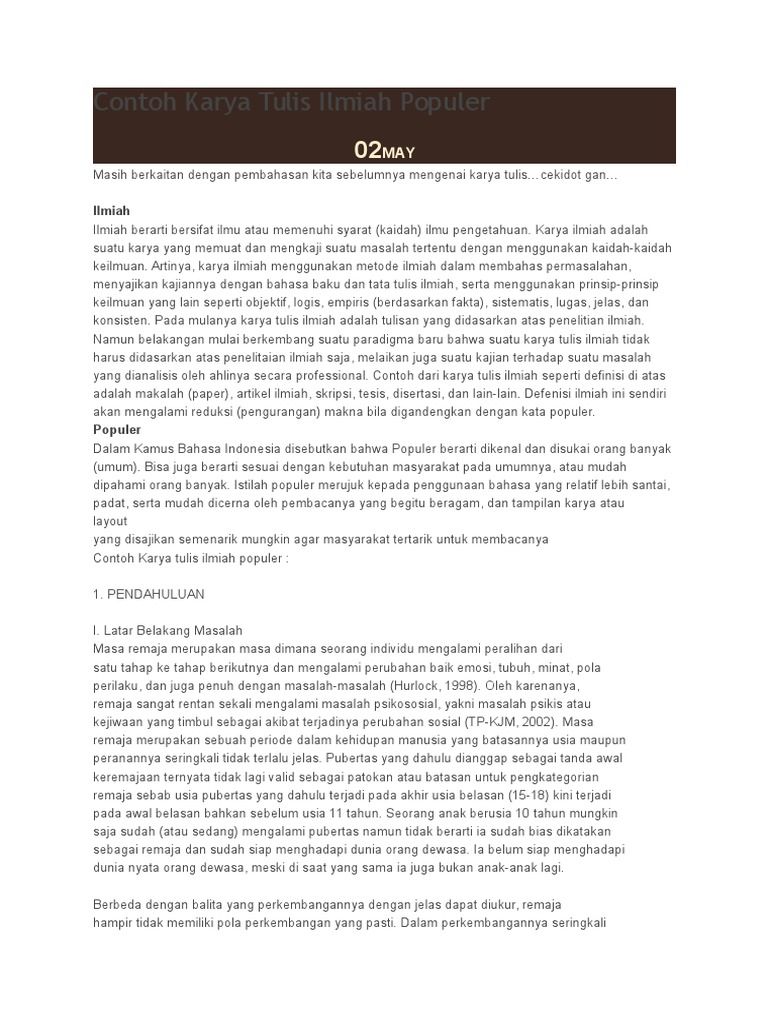 Contoh karya ilmiah populer terlengkap halo bro sis siapa sih yang tidak pernah mendengar karya ilmiahatau mungkin bro sis yang sedang membaca artikel badrul mozila ini sedang diberikan tugas oleh gurudosen untuk mencari atau mengerjakan karya ilmiah ya. Karya ilmiah populer merupakan suatu karya yang ditulis dengan menggunakan bahasa yang populer sehingga mudah dipahami oleh masyarakat dan menarik untuk dibaca. Di tulis untuk menambah pengetahuan sesuai dengan permasalahan yang dibahas. 155 karangan ilmiah populer adalah semacam karangan ilmiah yang mencakup ciri ciri karangan ilmiah yaitu menyajikan fakta fakta secara cermat jujur netral dan sistematis sedangkan. Untuk tata cara penulis karya tulis ilmiah serta artikel ilmiah ini ada sejumlah kesamaan yang tidak dapat dipisahkan satu sama lainnya kesamaan tersebut ialah adanya 3 langkah. Artikel ilmiah menjadi salah satu pokok bahasan yang sangat penting dalam dunia pendidikan artikel ilmiah ini sendiri berkaiatn erat dengan karya tulis ilmiah.