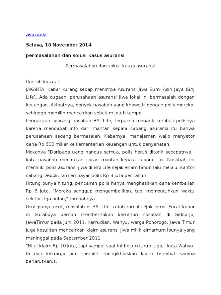 Contoh di inggris dalam kasus joyce v. Buktinya penetrasi asuransi di indonesia hanya sekitar 17 persen saja. Warta kota bogor yayasan lembaga konsumen indonesia ylki menduga sengketa perasuransian yang melibatkan pt asuransi jiwa manulife indonesia mengandung modus umum perusahaan asuransi untuk merugikan konsumen kenapa kami katakan begitu karena hampir semua kasus asuransi yang terjadi itu disebabkan penolakan klaim. Dari awal pihak asuransi menjelaskan secara terperinci tentang aturan aturan maupun ketrentuan yang berlaku dalam asuransi dan para nasabah seharusnya mempelajari semua tentang atau yang berhubungan dengan asuransi supaya kedepannya tidak terjadi kesalapahaman. Director of public prosecutions 1946 dan amerika serikat dalam kasus iran hostages crisis 1979 1980. Manajemen proyek perbankan manajemen kata manajemen berasal dari bahasa prancis kuno ménagement yang memiliki arti seni melaksanakan dan mengatur.