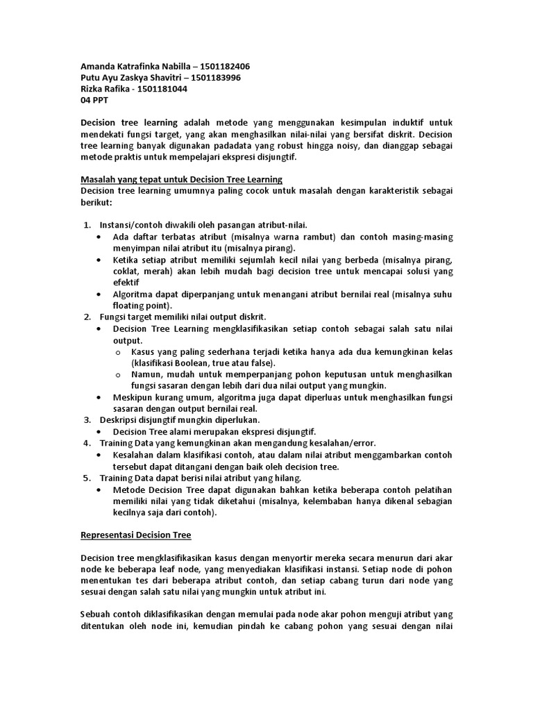 Pttambang dalam mencari minyak bumi akan memutuskan apakah menggunakan peta geologi biaya 25 atau tidak. Decision tree dengan algoritma c45 algoritma c45 skipsi teknik informatika contoh skripsi algoritma. Decision maker hanya mengambil satu keputusan 2. Contoh aplikasi credit risk berikut ini merupakan contoh dari salah satu kasus resiko kredit credit risk yang menggunakan decision tree untuk menentukan apakah seorang potential customer dengan karakteristik saving asset dan income tertentu memiliki good credit risk atau bad credit risk. Karena kasus di atas adalah contoh belaka dengan jumlah atribut dan tuple yang tidak banyak maka metode coba coba untuk pemilihan node kedua di atas hanya untuk memberikan ilustrasi solusi dari kasus di atas. Gambar decision tree sementara.