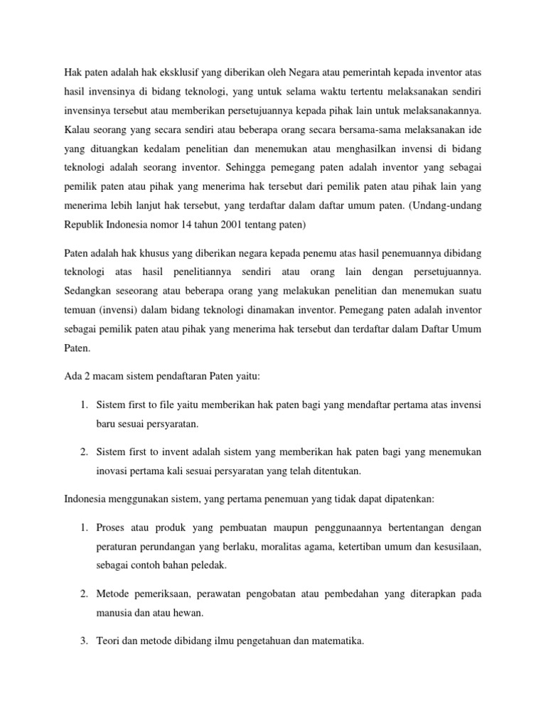 Perusahaan asal india mengklaim penggunaan dua busi dalam satu silinder pada produk mereka itu merupakan ystem pertama yang digunakan di dunia. Contoh kasus hak paten hak paten adalah hak eksklusif yang diberikan oleh negara atau pemerintah kepada inventor atas hasil invensinya di bidang teknologi yang untuk selama waktu tertentu melaksanakan sendiri invensinya tersebut atau memberikan persetujuannya kepada pihak lain untuk melaksanakannya. Jenis patennya sangat luas mulai dari tanda yang memperlihatkan pesan sudah terkirim hingga konsep tag pengguna. J habibie dengan auronautika. Terlebih setelah pernyataan terbaru dari perusahaan yang didirikan oleh steve jobs tersebut. Blackberry mempermasalahkan tujuh paten perangkat lunak terhadap facebook.