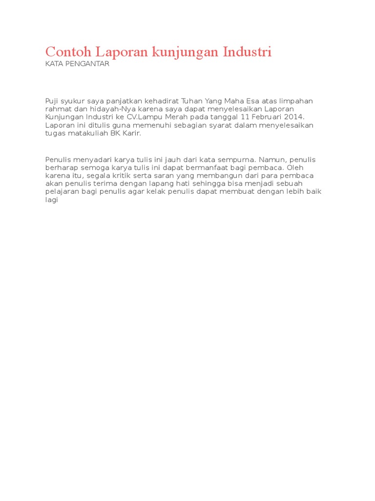 Kata pengantar kunjungan industri kata pengantar puji syukur kehadirat allah swt atas petunjuk rahmat dan hidayah nya penulis dapat menyelesaikan laporan kunjungan industri tanpa ada halangan apapun sesuai dengan waktu yang telah ditentukan. Tema laporan kunjungan industri. Baik menyusun karya ilmiah maupun karya non ilmiah.