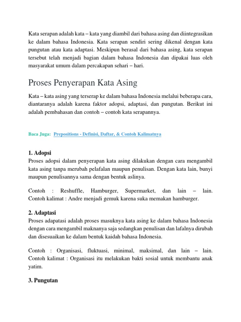 Contoh kata serapan adopsi. Di bawah ini akan dibagikan daftar 1000 kata serapan dari bahasa asing baik dari bahasa inggris arab belanda china portugis jepang hindi persia dan lain lain baik contoh kata serapan adopsi dan adaptasi. Contoh kata serapan adopsi kata yang menyerap memainkan peran variasi tambahan bahasa indonesia. Kata serapan pengertian daftar bahasa arab penulisan contoh dosenpendidikancom secara etimologi kata dalam bahasa melayu dan indonesia diambil dari bahasa sansekerta kathā. Dalam bahasa sansekerta katha sebenarnya artinya adalah konversasi bahasa cerita atau dongeng. Kata serapan adalah kata yang berasal dari luar bahasa indonesia asing daerah yang di integrasikan ke dalam bahasa indonesia dan secara konvensional dapat diterima oleh masyarakat. Kata serapan merupakan kata yang berasal dari kata asing yang diserap menjadi kata indonesia dengan atau tanpa mengubah gaya penulisan dan cara bacanya yang kemudian ejaan ucapan dan tulisannya disesuaikan dengan penuturan masyarakat indonesia untuk memperkaya kosa kata.