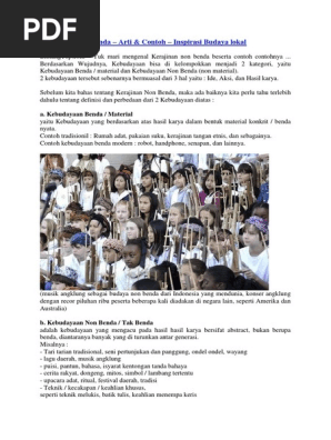 Contoh kerajinan dengan inspirasi budaya lokal non benda. Kerajinan dengan inspirasi budaya lokal non benda adalah salah satu jenis kerajinan yang memfokuskan pada kerajinan yang idenya berasal dari budaya budaya tradisional dalam negeri yang bukan benda seperticerita rakyat mitos tarian pantun. Usaha kerajinan benda yang inspirasinya ide pembuatannya berasal atau berkaitan dengan kebudayaan lokal tradisional dalam negeri yang bukan benda. Kerajinan budaya lokal non benda. Wirausaha kerajinan dengan inspirasi budaya non benda dapat dimulai dengan melihat potensi bahan baku material keterampilan produksi man machine dan budaya lokal yang ada di daerah setempat. Wirausaha kerajinan dengan inspirasi budaya akan menawarkan karya karya kerajinan inovatif kepada pasaran. Lalu apakah yang dimaksud kerajinan tangan dengan budaya lokal non benda.