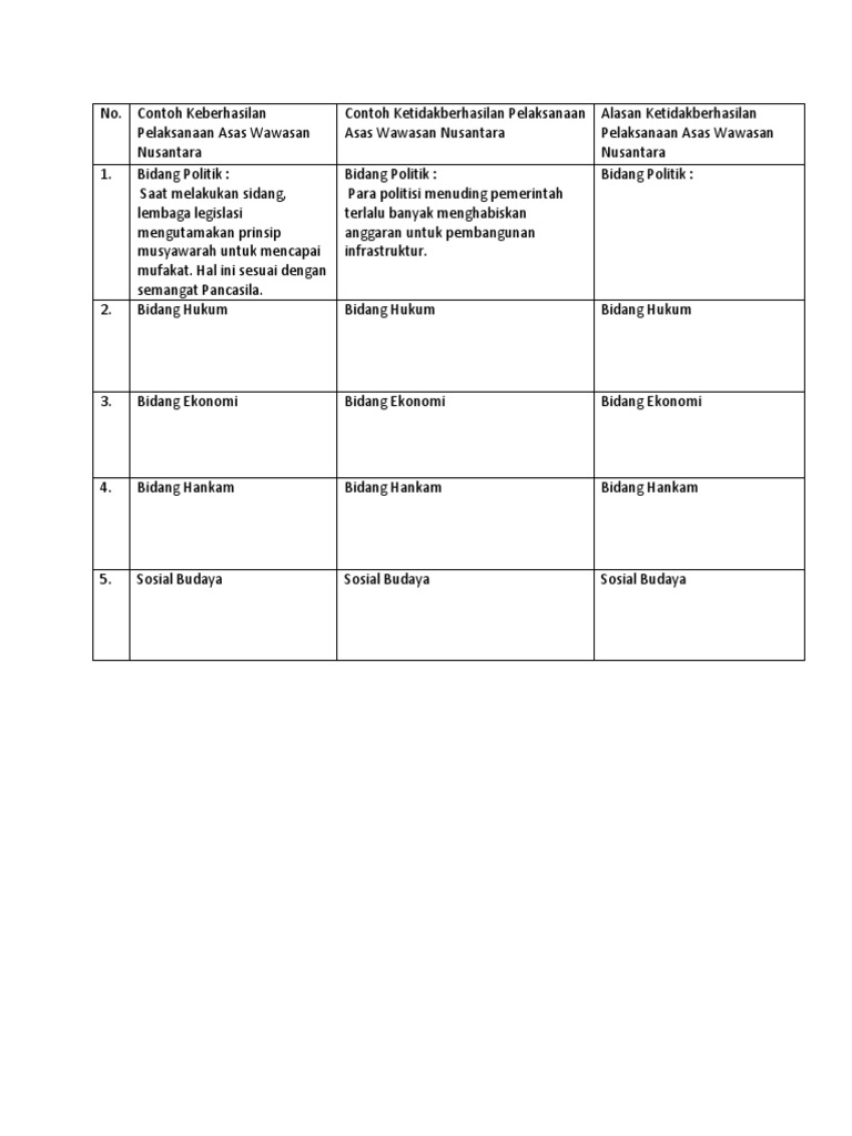Beberapa contoh keberhasilan pelaksanaan asas wawasan nusantara dapat dilihat dalam hal hal seperti tertera di bawah ini. Apakah contoh dan alasan ketidakberhasilan pelaksanaan wawasan nusantara tersebut. Wawasan nusantara dapat diaplikasikakn pula dalam berbagai bidang termasuk politik hukum ekonomi dan pertahanan keamanan atau hankam. Kuberhasil pelaksanaan asas wawasan nusantara di dalam bidang ekonomi dapat dilihat di dalam contoh contoh di bawah ini. Ada beberapa pelaksanaan asas wawasan nusantara yang tidak berhasil. Asas dan arah pandang wawasan nusantara asas wawasan nusantara menurut kamus besar bahasa indonesia asas diartikan sebagai dasar sesuatu yg menjadi tumpuan berpikir atau berpendapat ketentuan ketentuan atau kaidah kaidah dasar yang harus dipatuhi ditaati dipelihara dan diciptakan demi tetap taat dan setianya komponen pembentuk bangsa indonesia terhadap kesepakatan bersama.