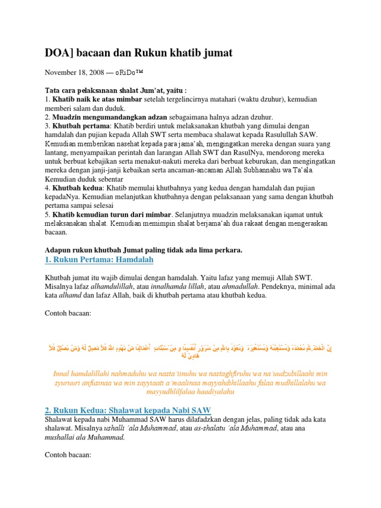Mungkin mendengar kata khutbah itu sudah tak asing lagi untuk kalian. Banyak keutamaan keutamaan yang allah swt. Kali ini kami akan coba membahas mengenai contoh khutbah jumat. Turunkan di hari ini. Doa bacaan dan rukun khatib jumat november 18 2008 orido tata cara pelaksanaan shalat jumat yaitu. Jumat adalah hari yang agung.