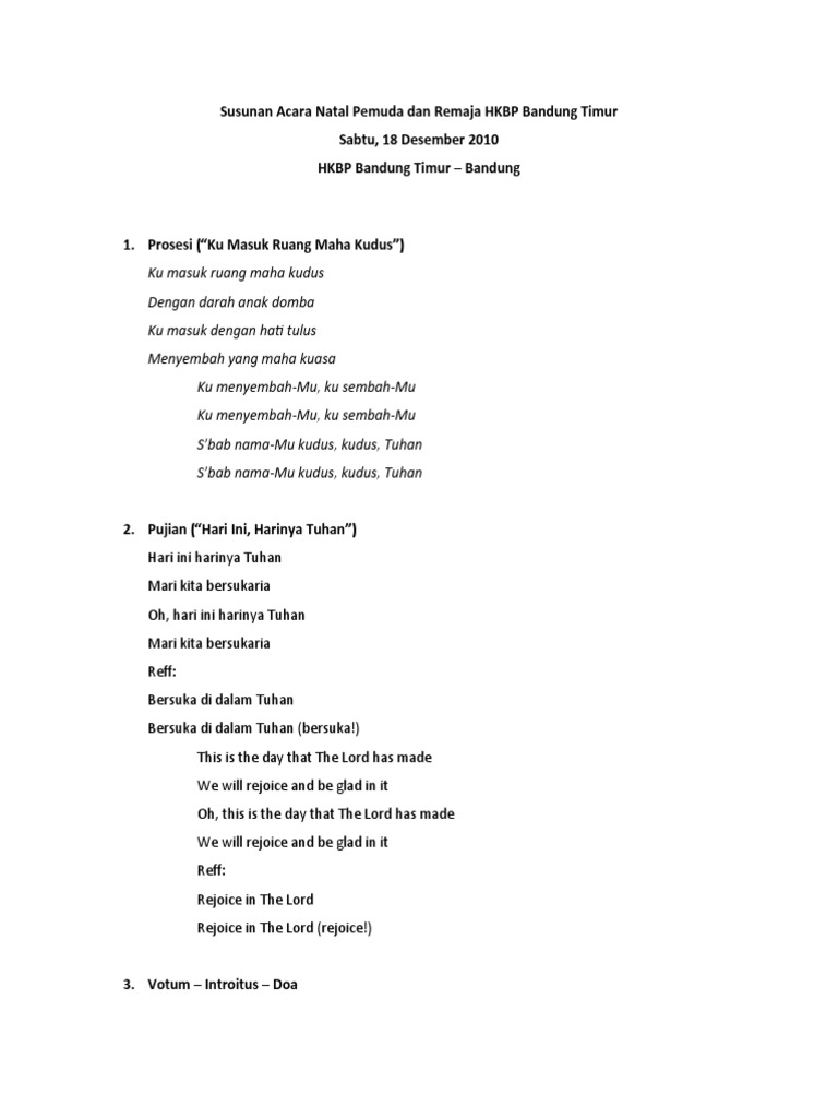 Kiranya susunan acara ini dapat menjadi contoh bagi kita semua. Kebersamaan natal sumber kekuatan 1 petrus 122 23 i. Ice breaker games dipimpin seorang guru bisa pilih dari lagu2 dan permainan ini kupikir pikir. Di indonesia sendiri yang memiliki beragam adat budaya acara resepsi pernikahan masih menerapkan aturannya masing masing daerah. Susunan perayaan ibadah natal 25 desember tema. Contoh karangan usaha untuk mencapai kerjaya impian.