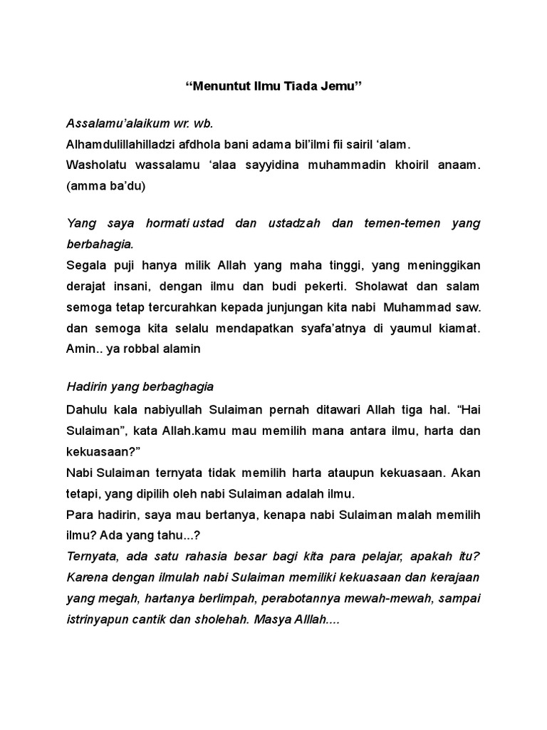 Kewajiban menuntut ilmu menuntut ilmu merupakan salah satu hal yang utama dalam agama islam islam memandang menuntut ilmu sebagai bagian dari ibadah yang diharuskan bagi segenap kaum muslimin dimanapun beradamenuntut ilmu juga sejatinya menjadi pembeda antara seorang yang berilmu dengan seorang yang bodoh. Indahnya berbagi study ceramah singkat pentingnya menuntut ilmu ceramah singkat pentingnya menuntut ilmu. Untuk mengatasi hal tersebut blog ini akan memberikan salah satu contoh bagi kita yang membutuhkan materi tentang ceramahpidatokultum seperti yang terlihat di bawah ini. Selama hayat masih dikandung badan mari kita selalu menuntut ilmu tanpa mengenal lelah karena ilmu sangat penting dalam. Jika kita hendak memberi ceramahpidatokultum pasti kita membutuhkan materi dong. Contoh ceramah untuk kamu yang sedang mencari contoh ceramah tentang menuntut ilmu berikut ini sebuah contoh ceramah singkat atau kultum yang bisa dijadikan sebagai bahan referensi untuk kamu ceramah mengenai pentingnya dalam menuntut ilmu terutama ilmu agama.