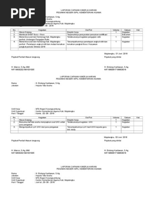 Kumpulah contoh laporan lengkap laporan adalah suatu bentuk penyampaian berita keterangan pemberitahuan ataupun pertanggungjawaban baik secara lisan maupun secara tertulis dari bawahan kepada atasan sesuai dengan hubungan wewenang authority dan tanggung jawab responsibility yang ada antara mereka. 196305021987 021001 jabatan. Setelah sebelumnya ditulis mengenai sistem akuntabilitas kinerja instansi pemerintah sakip dan salah satu tahapan sakip yakni penyusunan perjanjian kinerja berikut salah satu tahapan penting dalam sistem akip yakni penyusunan laporan kinerja instansi pemerintah. Jika kalian kerja menjadi pegawai atau karyawan pns maupun proyek kontraktor. Contoh contoh indikator kinerja. Berdasarkan surat edaran sekretaris jenderal kementerian agama ri nomor sjbiv223852015 tanggal 13 januari 2015 sebagaimana gambar dibawah tentang pembuatan laporan capaian kinerja bahwa dalam rangka mempertanggungjawabkan pencairan tunjangan kinerja diharuskan untuk membuat laporan capaian kinerja harian masing masing sebagaimana contoh format.