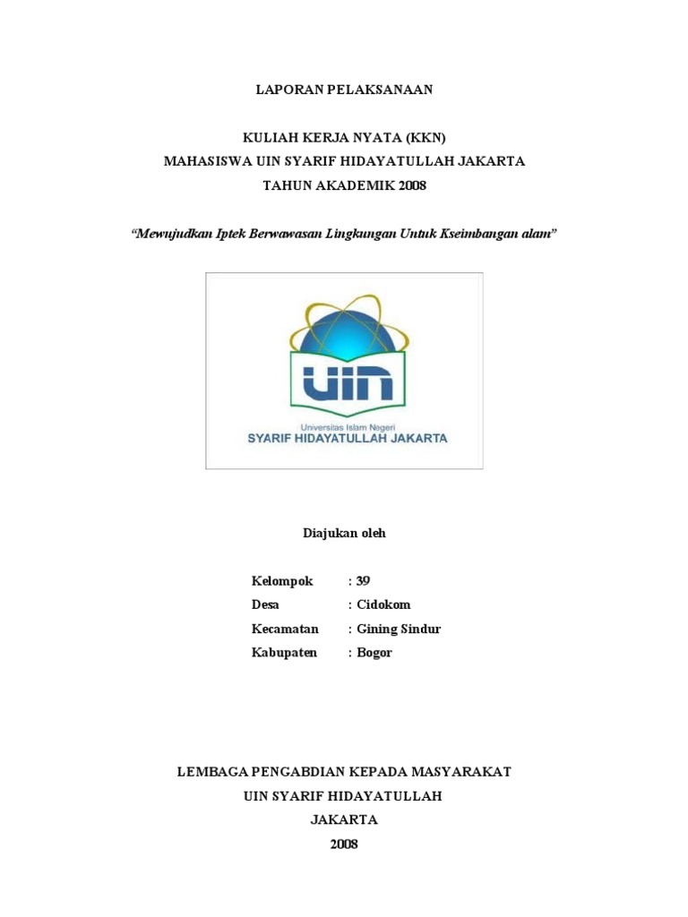 Sementara itu contoh lengkap laporan kkn untuk stain iain dan uin di bawah ini diambil dari salah satu laporan kkn dari iain walisongo. Penyusun sepenuhnya menyadari bahwa masih terdapat kekurangan dalam penulisan laporan kuliah kerja nyata ini. Laporan ini disusun berdasarkan pengetahuan dan pengamatan kami dalam pelaksanaan program kkn pola sibermas universitas mahasaraswati denpasar yang berlokasi di pura mengening desa saraseda kecamatan tampaksiring kabupaten gianyar yang berlangsung sejak tanggal 25 juli hingga 3. Laporan kkn ini berisi bab i bab ii dan bab iii. Pelaksanaan kkn di desa pasauran terbagi menjadi 3 kelompok. Laporan akhir kkn kelompok 5 fakultas keperawatan unsyiah bab i pendahuluan kuliah kerja nyata kkn yang lahir dari proses pembangunan pada hakikatnya merupakan pelaksanaan dari falsafah pendidikan nasional dalam rangka tri darma perguruan tinggi yaitu pendidikan penelitian dan pengabdian pada masyarakat.