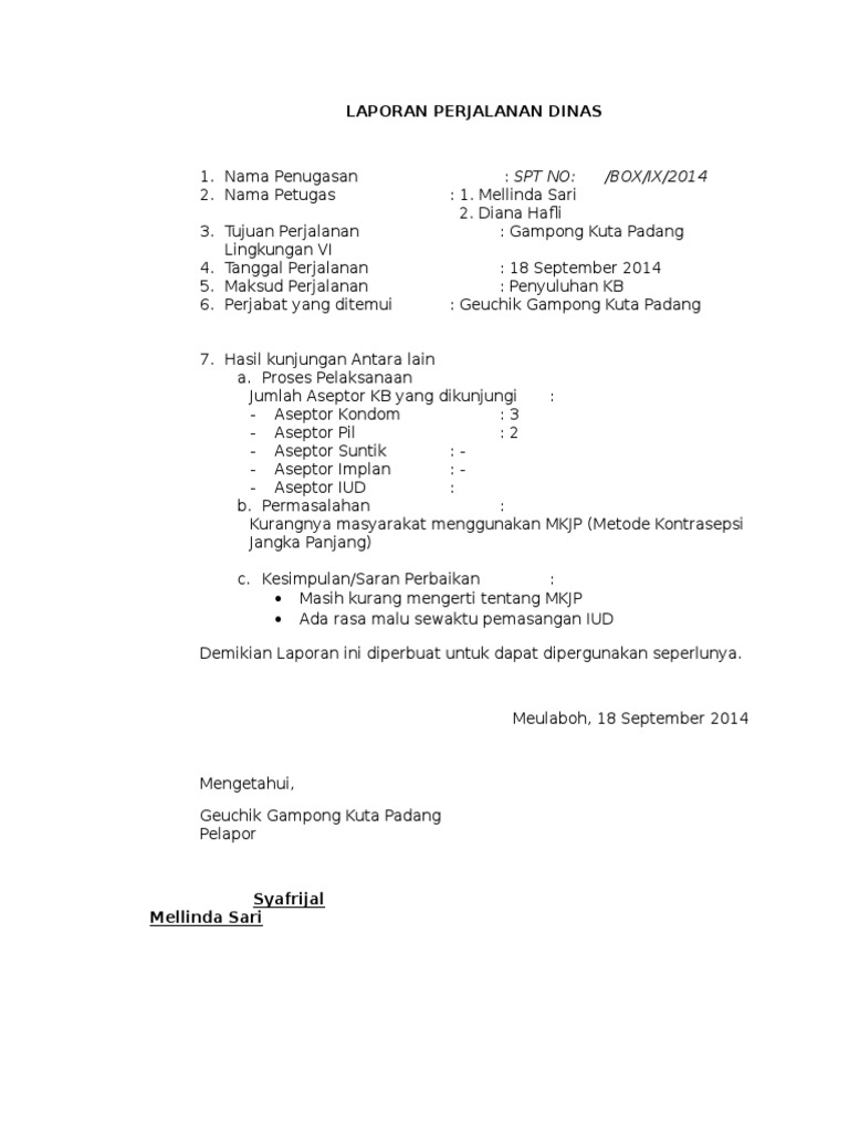 Contoh laporan perjalanan dinas sederhana. Asam kampung lab. Dinas kesehatan puskesmas labanan. Contoh surat perintah perjalanan dinas. Contoh surat perintah perjalanan dinas sppd merupakan surat perintah yang dibutuhkan oleh seorang pegawai dalam melaksanakan tugas kerja dan harus pergi ke daerah lain luar kota. Perjalanan dinas ke puskesmas biatan lempake dalam rangka monitoring dan evaluasi penyelenggaraan program jamkesmas jampersal dan jamkesda pada pelayanan kesehatan dasar di puskesmas. Tugas kerja tersebut bisa berupa study banding audit ke perusahaan cabang rapat kerja nasional maupun pekerjaan pekerjaan lain yang dilakukan di luar kota tidak di lingkungan kantor sendiri.
