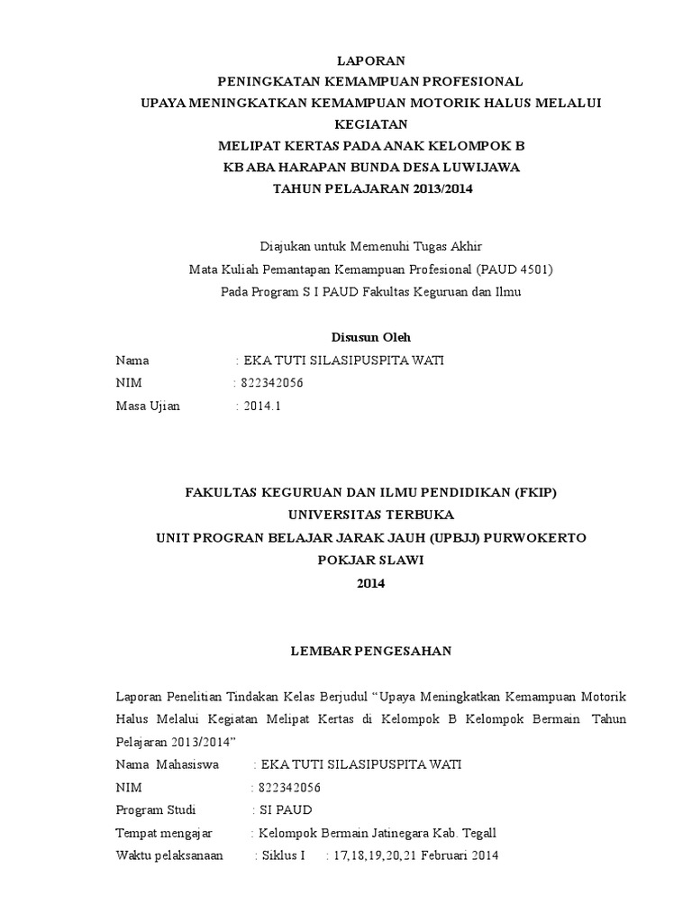 Contoh laporan pkp paud. Senang sekali kami bisa menyapa teman teman ut khusunya teman teman jurusan pendidikan guru pendidikan anak usia dini pgpaud yang saat ini sedang menempuh pendidikan pada semester viii delapan. Contoh laporan best practice pkp paud. Contoh laporan pkp ut pgpaud lengkap kami bagikan untuk anda mahasiswa ut universitas terbuka jurusan s1 pgpaud pendidikan guru pendidikan anak usia dini. Softgaleri adalah blog yang berbagi informasi download contoh soal soal uts kelas 1 2 3 4 5 6 sdmi siap cetak. Academiaedu is a platform for academics to share research papers. Apalagi sebagian besar mahasiswa ada yang tidak bisa mengoprasikan komputer jadi mustahil untuk membuat laporan sendiri.