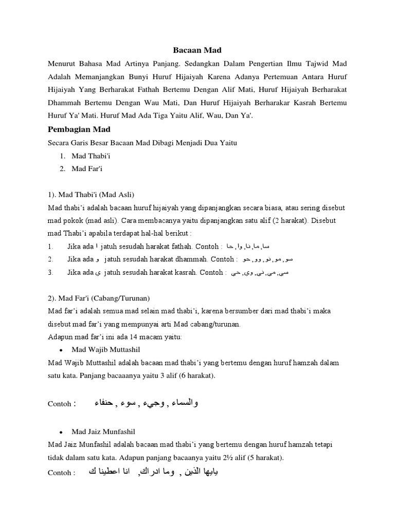 Mad ini masih diperdebatkan tentang mad fari yang berjumlah 15 dengan penjelasan yang dibahas dalam artikel sebelumnya. Mad fari sendiri dibagi menjadi tiga belas macam. Salah satunya adalah mad fari. Untuk lebih jelasnya mengenai hukum kelima belas mad tersebutkita akan mengulas lebih lengkap tentang macam macam dan contoh hukum bacaan mad dibawah ini. مدفرق mad farqi yaitu mad badal sesudahnya berupa huruf yang bertasydid panjangnya 6 harokat. Secara umum mad dibagi menjadi 2 macam yaitu mad thabii mad asli dan mad fari cabangnya atau bagianya.