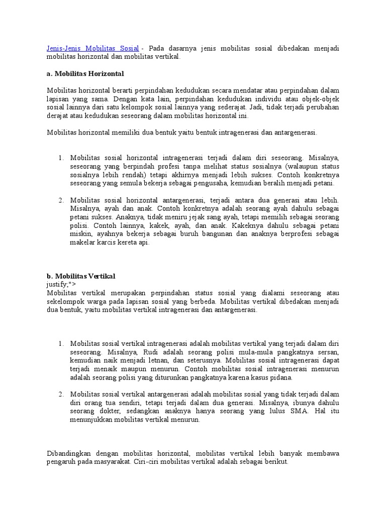Contoh mobilitas sosial di masyarakat. Apabila terjadi perbedaan kepentingan antara kelas kelas sosial yang ada di masyarakat dalam mobilitas sosial maka akan muncul konflik antarkelas. Bentuk utama mobilitas sosial naik ada dua macam yaitu petama sebagaimana yang telah disebutkan dalam contoh di atas meliputi perubahan posisi sosial dari bawah ke posisi yang lebih atas. Contoh mobilitas sosial horizontal dalam masyarakat misalnya saja adanya pepindahan kewarganegaraan yang dilakukan oleh seseorang. Gerak dan perubahan yang terjadi di dalam struktur sosial merupakan cermin adanya mobilitas sosial social mobilitymisalnya seorang murid yang melanjutkan kuliah setelah lulus mengalami mobilitas sosial naik berdasarkan level pendidikan formalnya. Pada umumnya mobilitas sering diartikan sebagai suatu proses perpindahan atau juga suatu pergerakan lapisan atau strata sosial seseorang maupun kelompok. Secara epistomologis kata mobilitas sosial berasal dari kata mobilis bahasa latin yang berarti bergerak dan social bahasa inggris yang berarti masyarakat.