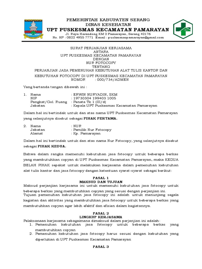 Contoh perjanjian kerjasama usaha mou agar kamu lebih mudah memahami serta dapat membuat surat perjanjian usaha sesuai dengan kebutuhannya kami menyediakan contoh mou di bawah ini. Contoh surat perjanjian kerjasama bagi hasil. Contoh mou kerjasama puskesmas. Mou atau memorandum of understanding merupakan sebuah surat yang digunakan untuk melakukan kerjasama dari kedua belah pihak yang berbeda. Berikut adalah contoh mou kerjasama antara puskesmas dan rumah sakit mengenai rujukan pasien berikut contoh suratnya. Puskesmas cijulang dinas kesehatan kabupaten pangandaran dalam hal ini bertindak untuk dan atas nama puskesmas cijulang kabupaten pangandaran selanjutnya di sebut sebagai pihak kedua.