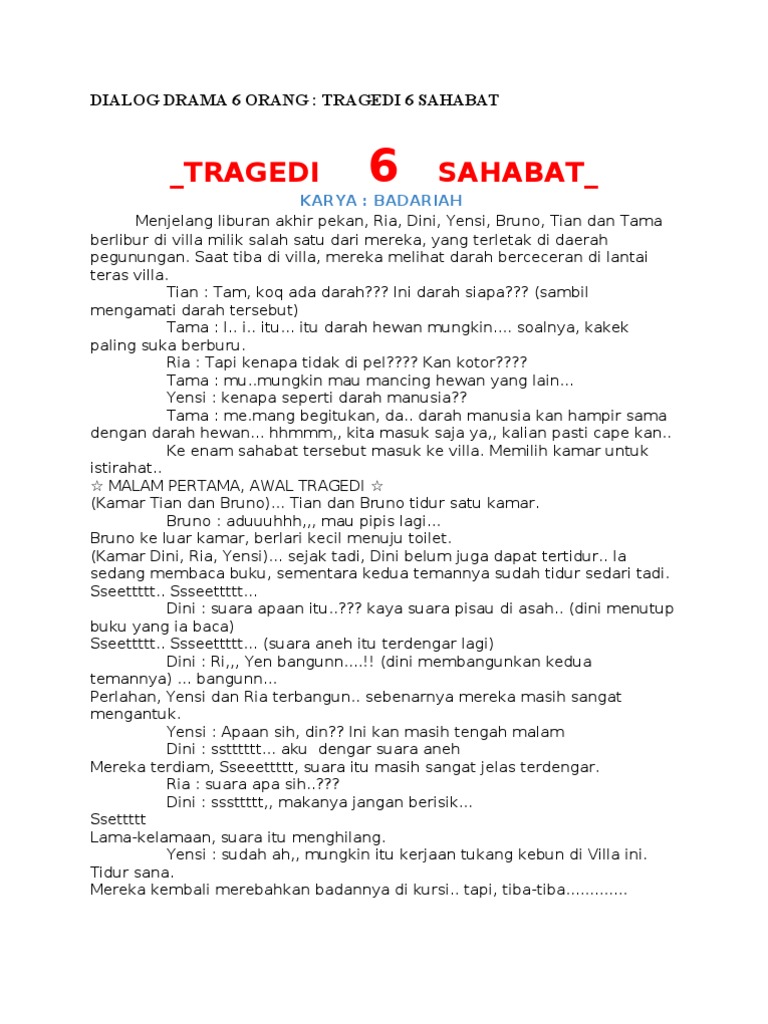 Contoh naskah drama singkat untuk 6 orang tentang persahabatan. Begitulah yang dialami oleh dua kelompok remaja murid smp 4 sindang ini. Kumpulan contoh naskah drama pendek atau singkat tentang komedi persahabatan percintaan yang lucu menarik gokil tidak membosankan panjang yang dimainkan 4 5. Di bawah ini akan kami sajikan beberapa contoh teks drama singkat yang bisa membantu kalian untuk membuat drama. Teater persahabatan lucu komedi 3 5 6 7 8 9 orang untuk pembahasan kali ini kami akan mengulas mengenai naskah drama yang dimana. Pengertian teks drama menurut budianta dkk adalah sebuah genre sastra yang penampilan fisiknya memperlihatkan secara verbal adanya dialogue atau cakapan diantara tokoh tokoh yang ada. Alangkah baiknya saat kita mengetahui apakah drama itu.