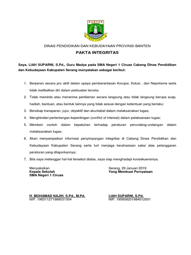 Oleh admin diposting pada 30 januari 2017. Berkomitmen untuk mewujudkan visi dan misi pendidikan. Itulah contoh contoh surat pakta integritas yang formal dan tepat sebagai referensi untuk anda dan dapat didownload secara gratis tanpa harus daftar terlebih dahulu. Integritas berasal dari bahasa latin integer. Incorruptibility firm adherence to a code of especially moral a acristic values yaitu yang artinya sikap yang teguh mempertahankan prinsip tidak mau korupsi dan menjadi dasar yang melekat pada diri sendiri sebagai nilai nilai moral. Integritas bukan hanya sekedar bicara pemanis retorika tetapi juga sebuah tindakan.