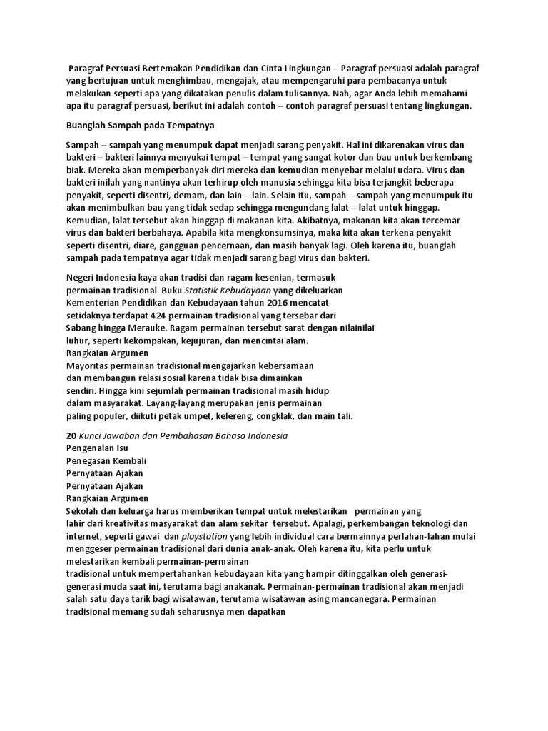 Salah satu alasan mengapa lingkungan di sekitar kita bisa tercemar adanya masih banyaknya limbah rumah tangga yang sering kali dibuang begitu saja di sembarang tempat. Pada sebuah paragraf biasanya mempunyai suatu susunan yang diawali dengan kalimat utama kemudian akan disusul dengan kalimat pendukung atau penjelasannya. Paragraf persuasi adalah sebuah paragraf yang berisi kalimat berupa ajakan atau perintah membujuk agar pembaca mau melakukan sesuatu seperti yang penulis ungkapkan dalam paragraf tersebut. Contoh paragraf persuasi kesehatan pendidikan budaya lingkungan banjir dll hallo sahabat pembaca yang budiman pada kesempatan yang berbahagia kali ini kita akan membahas makalah tentang contoh paragraf persuasi yang meliputi pengertian ciri ciri hingga bebarap contohnya lengkapuntuk itu mari langsung saja kita simak uraian materinya dibawah berikut ini. Contoh paragraf persuasif tentang lingkungan. Pencemaran sungai ciliwung sudah sangat parah dan dapat dikategorikan sebagai pencemaran tingkat berat.