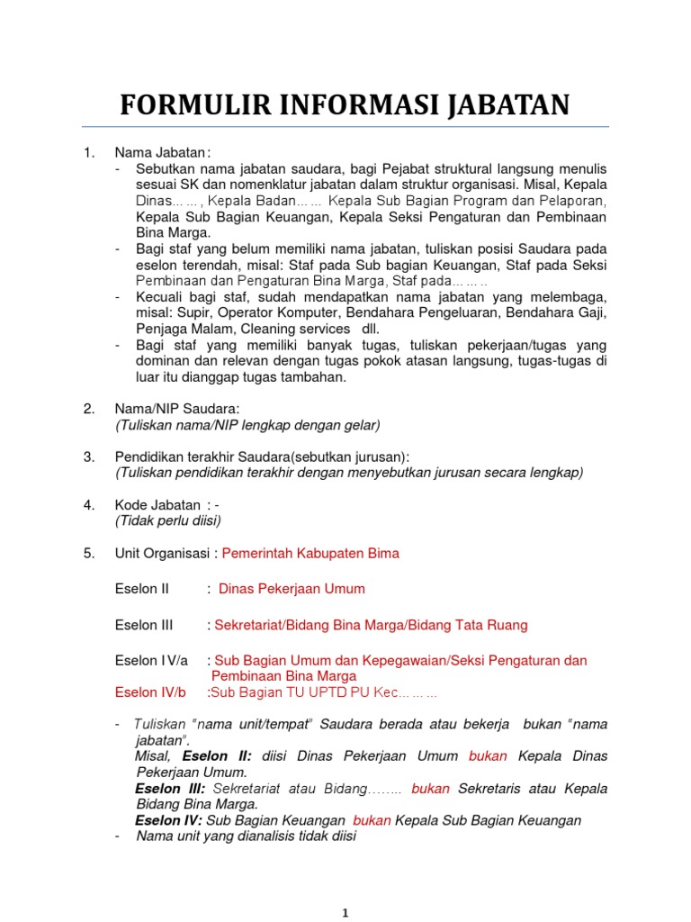 Contoh pengisian formulir analisis jabatan. Contoh format dan aplikasi analisis beban kerja abk ini mudah mudahan bisa menjawab pencarian anda di internet terkait dengan abk seperti contoh abk untuk guru contoh analisis beban kerja guru sd perhitungan beban kerja guru contoh analisis beban kerja kepala sekolah sd format beban kerja guru contoh pengisian formulir analisis jabatan guru contoh analisis beban kerja guru smp dan lain. Peran analisis jabatan dalam manajemen sumber daya manusia suatu pengetahuan yang eksplisit dan terperinci mengenai setiap jabatan sangatlah diperlukan antara lain untuk keperluanrekrutmen seleksi dan penempatan tenaga kerja menentukan besarnya upah merancang jalur karir pekerja pegawai menetapkan beban kerja yang pantas dan adil merancang program pendidikan dan pelatihan yang efektif. Sehubungan dengan hal hal tersebut diatas dimohon saudara segera menyampaikan analisis jabatan dan analisis beban kerja sesuai dengan struktur organisasi yang baru kepada kepala bkn cq kepala pusat ncanaan kepegawaian dan formasi dengan surat pengantar yang datangani oleh pejabat pembina kepegawaian dalam bentuk soft copy melalui email. 1 1 mendukung tandai dokumen ini sebagai bermanfaat 0 0 menolak tandai dokumen ini sebagai tidak bermanfaat tanamkan. Contoh analisis jabatan guru mata pelajaran. 17 tahun 2017 tentang ppdb tahun 2017.