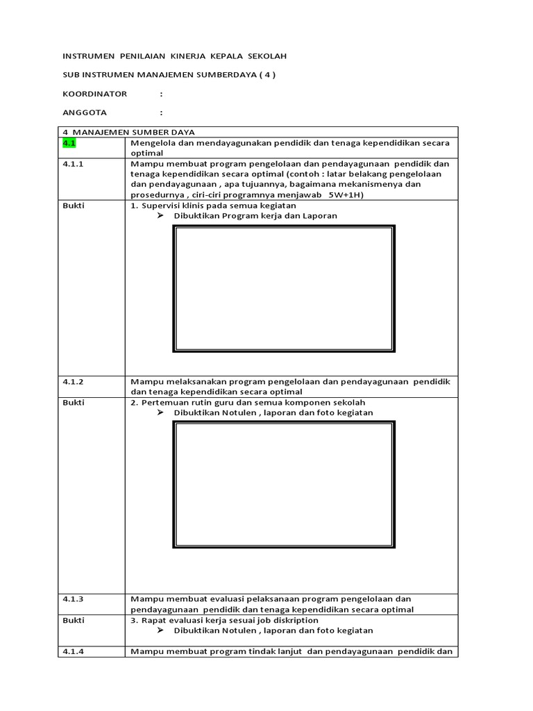 Contoh pengisian instrumen penilaian kinerja kepala sekolah. Memuat jenisteknik penilaian bentuk penilaian instrumen dan pedoman penskoran. Disini kami memberikan file pkg berbentuk file msword dan buku 1234 dan 5 pedoman pk guru dan pkb guru dengan mengklik link unduh disini dibawah ini. Aplikasi instrumen pkks ini ini dapat digunakan untuk semua jenjang sekolah baik untuk kepala sekolah sdmi smpmts maupun smasmkma. Instrumen master pk kepala sekolahxls 49613 kb dalam peningkatan profesionalisme kepala sekolah adalah pengawas sekolah memiliki peran penting yang merupakan pemimpin pendidikan yang bersama sama kepala sekolah memiliki tanggung jawab terhadap perkembangan sekolah. Penilaian hasil belajar. Misalnya untuk penilaian kinerja guru dengan tugas tambahan sebagai kepala perpustakaan memiliki format tambahan hasil penilaian dan rincian kegiatan guru sehubungan dengan tugas tugas pengelolaan perpustakaan.