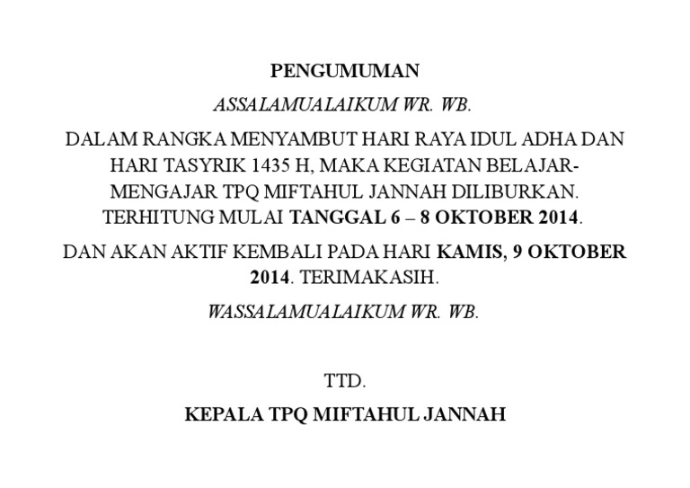 Contoh pengumuman libur lebaran karyawan nusagates these are so many great picture list that may become your enthusiasm and informational purpose of contoh surat izin masuk wilayah design ideas on your own collections. Contoh pengumuman libur lebaran 2019. Admin blog dapatkan contoh 2019 juga mengumpulkan gambar gambar lainnya terkait contoh surat pengumuman libur lebaran untuk karyawan dibawah ini. Kementerian komunikasi dan informatika pengumuman libur hari raya idul fitri 1437 h uajy surat edaran penetapan libur dan cuti bersama hari natal 2017 ditandatangani 3 menteri inilah jadwal libur nasional dan cuti. 15 contoh surat pemberitahuan libur lebaran paling lengkap liburan yang paling ditunggu sebagian besar kalangan masyarakat adalah libur lebaran. Surat pengumuman ini biasanya akan kita temui di lembaga pendidikan perusahaan instansi pemerintahan maupun organisasi.